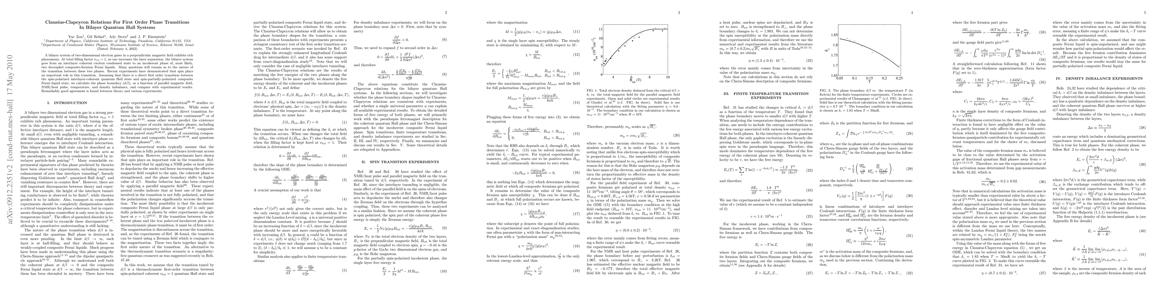 A bilayer system of two-dimensional electron gases in a perpendicular magnetic field exhibits rich phenomena. At total filling factor $\nu_{tot} = 1$, as one increases the layer separation, the bilayer system goes from an interlayer coherent exciton condensed state to an incoherent phase of, most likely, two decoupled composite-fermion Fermi liquids. Many questions still remain as to the nature of the transition between these two phases. Recent experiments have demonstrated that spin plays an important role in this transition. Assuming that there is a direct first order transition between the spin-polarized interlayer-coherent quantum Hall state and spin-partially-polarized composite Fermi liquid state, we calculate the phase boundary $(d/l)_c$ as a function of parallel magnetic field, NMR/heat pulse, temperature, and density imbalance, and compare with experimental results. Remarkably good agreement is found between theory and various experiments.