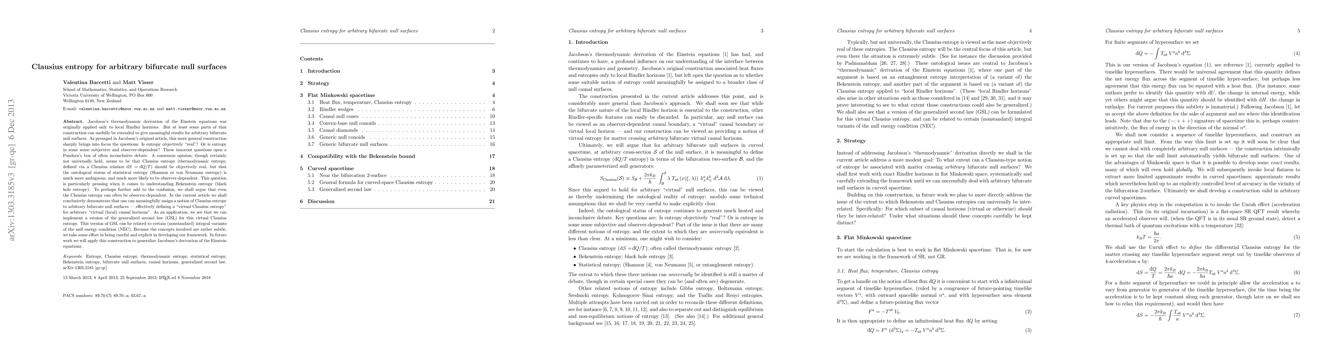 Jacobson's thermodynamic derivation of the Einstein equations was originally applied only to local Rindler horizons. But at least some parts of that construction can usefully be extended to give meaningful results for arbitrary bifurcate null surfaces. As presaged in Jacobson's original article, this more general construction sharply brings into focus the questions: Is entropy objectively "real"? Or is entropy in some sense subjective and observer-dependent? These innocent questions open a Pandora's box of often inconclusive debate. A consensus opinion, though certainly not universally held, seems to be that Clausius entropy (thermodynamic entropy, defined via a Clausius relation dS = dQ/T) should be objectively real, but that the ontological status of statistical entropy (Shannon or von Neumann entropy) is much more ambiguous, and much more likely to be observer-dependent. This question is particularly pressing when it comes to understanding Bekenstein entropy (black hole entropy). To perhaps further add to the confusion, we shall argue that even the Clausius entropy can often be observer-dependent. In the current article we shall conclusively demonstrate that one can meaningfully assign a notion of Clausius entropy to arbitrary bifurcate null surfaces --- effectively defining a "virtual Clausius entropy" for arbitrary "virtual (local) causal horizons". As an application, we see that we can implement a version of the generalized second law (GSL) for this virtual Clausius entropy. This version of GSL can be related to certain (nonstandard) integral variants of the null energy condition (NEC). Because the concepts involved are rather subtle, we take some effort in being careful and explicit in developing our framework. In future work we will apply this construction to generalize Jacobson's derivation of the Einstein equations.