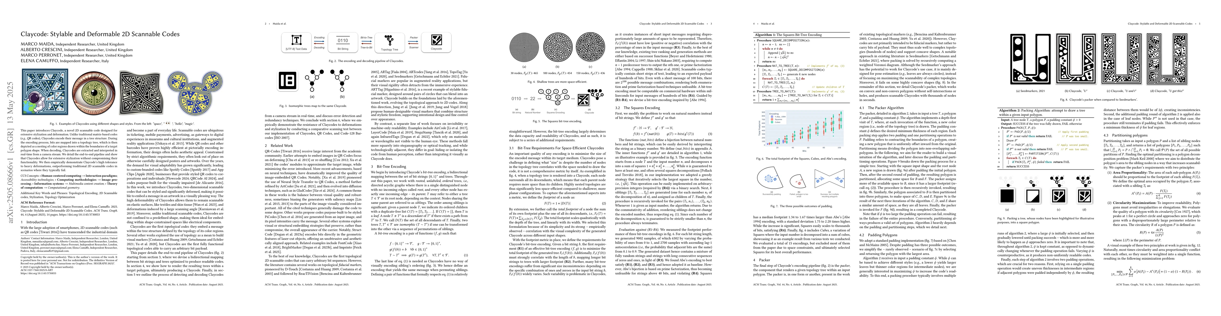 Claycode, a tree-structured 2D scannable code that allows for extensive stylization and deformation while maintaining readability.