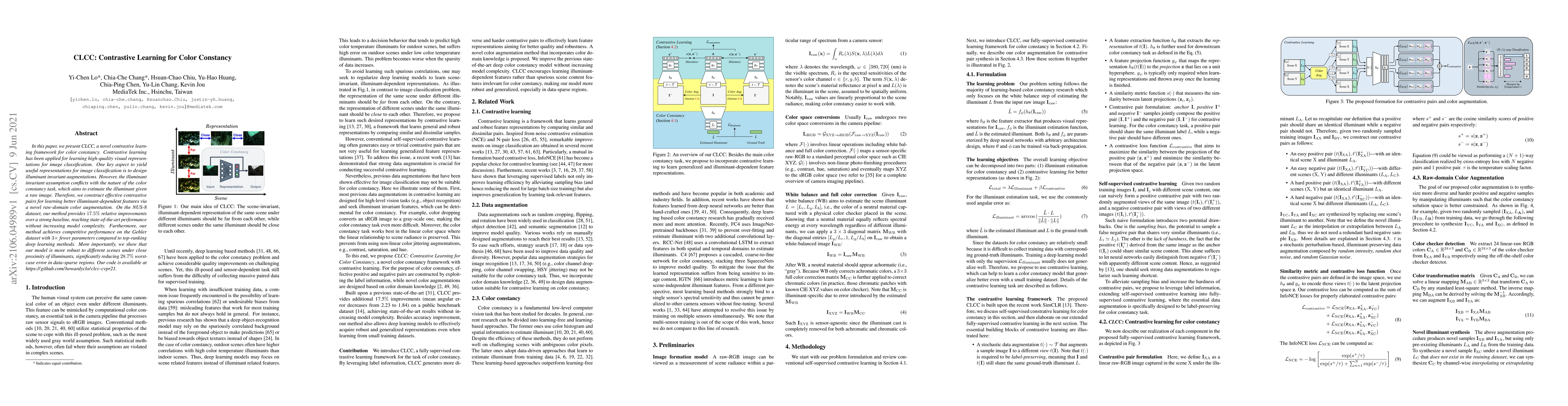 CLCC introduces a contrastive learning framework for color constancy, achieving state-of-the-art performance with improved robustness and reduced model complexity. It leverages raw-domain color augmentation to learn effective illuminant-dependent features, demonstrating significant improvements on multiple datasets.