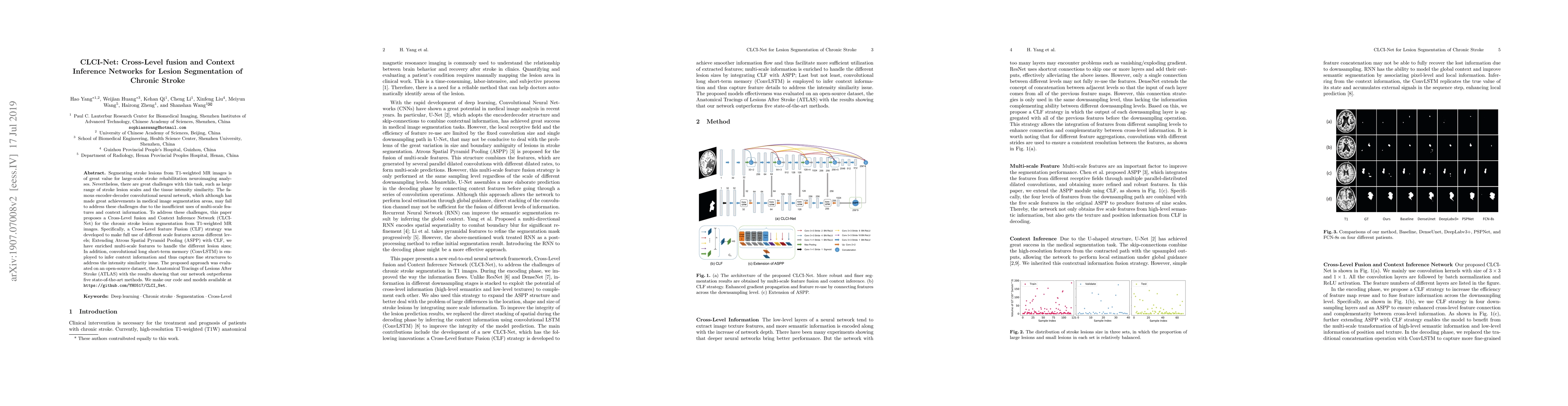 This paper proposes CLCI-Net, a Cross-Level fusion and Context Inference Network for segmenting chronic stroke lesions in T1-weighted MR images. The method utilizes a Cross-Level feature Fusion strategy and an extended Atrous Spatial Pyramid Pooling module to capture multi-scale features, and employs ConvLSTM for context inference to address intensity similarity issues, outperforming five state-of-the-art methods on the ATLAS dataset.