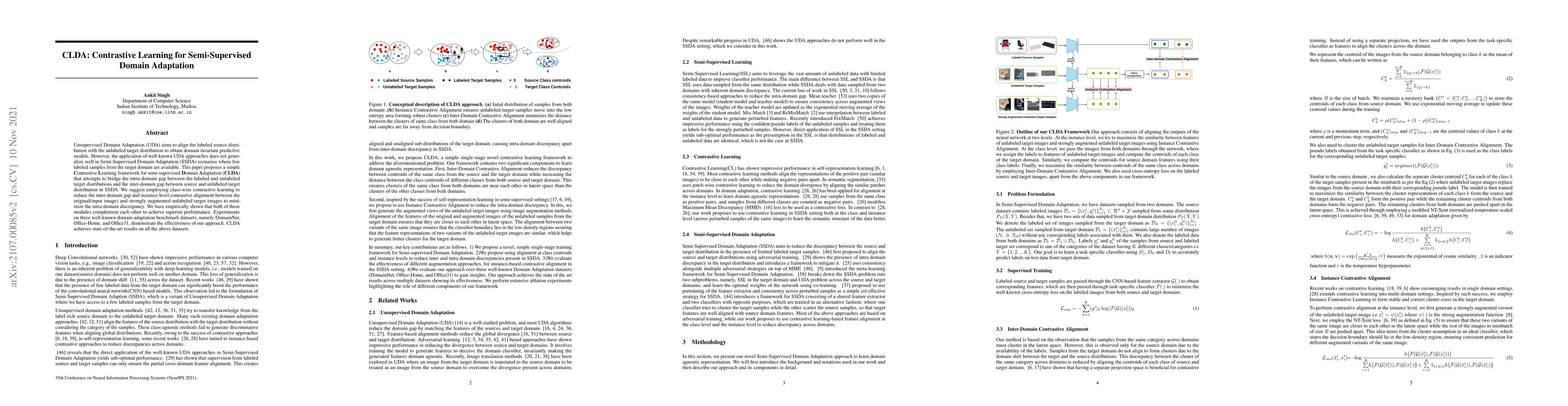 This paper introduces CLDA, a Contrastive Learning framework for Semi-Supervised Domain Adaptation that employs class-wise and instance-level contrastive learning to bridge domain gaps. Experimental results on DomainNet, Office-Home, and Office31 datasets demonstrate CLDA's superior performance and state-of-the-art results.