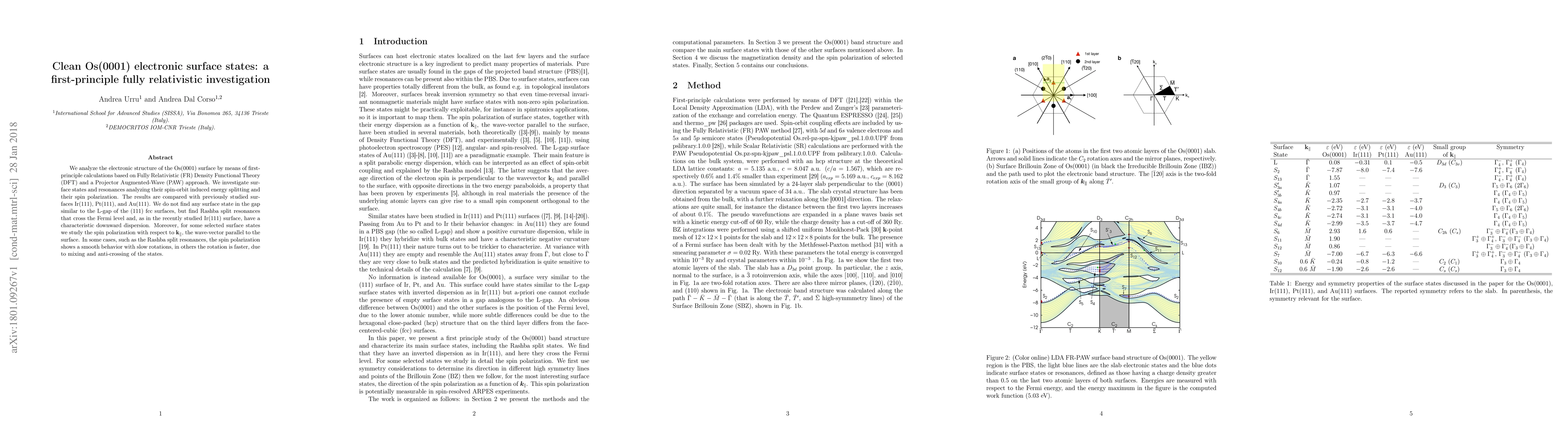 We analyze the electronic structure of the Os(0001) surface by means of first-principle calculations based on Fully Relativistic (FR) Density Functional Theory (DFT) and a Projector Augmented-Wave (PAW) approach. We investigate surface states and resonances analyzing their spin-orbit induced energy splitting and their spin polarization. The results are compared with previously studied surfaces Ir(111), Pt(111), and Au(111). We do not find any surface state in the gap similar to the L-gap of the (111) fcc surfaces, but find Rashba split resonances that cross the Fermi level and, as in the recently studied Ir(111) surface, have a characteristic downward dispersion. Moreover, for some selected surface states we study the spin polarization with respect to ${\bf k}_{\parallel}$, the wave-vector parallel to the surface. In some cases, such as the Rashba split resonances, the spin polarization shows a smooth behavior with slow rotations, in others the rotation is faster, due to mixing and anti-crossing of the states.