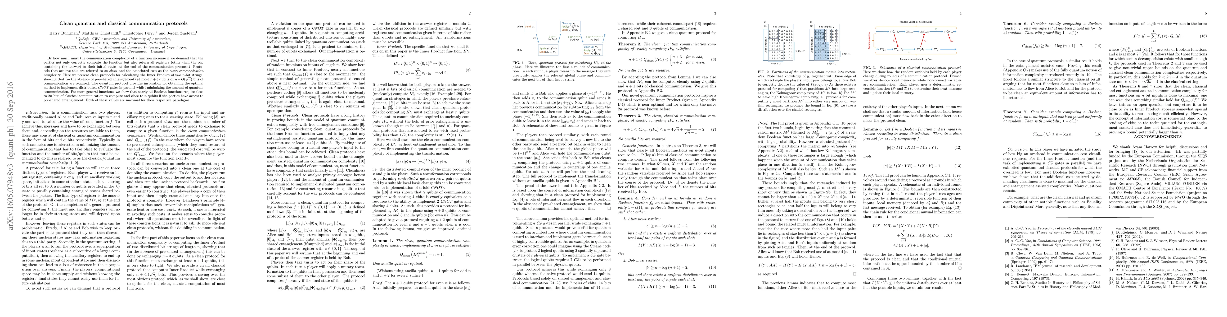 This paper explores clean communication protocols that require parties to return all registers to their initial states post-computation. It presents clean protocols for computing the Inner Product, showing minimal quantum and classical communication complexities, and provides insights into optimal parallel implementation of distributed CNOT gates.