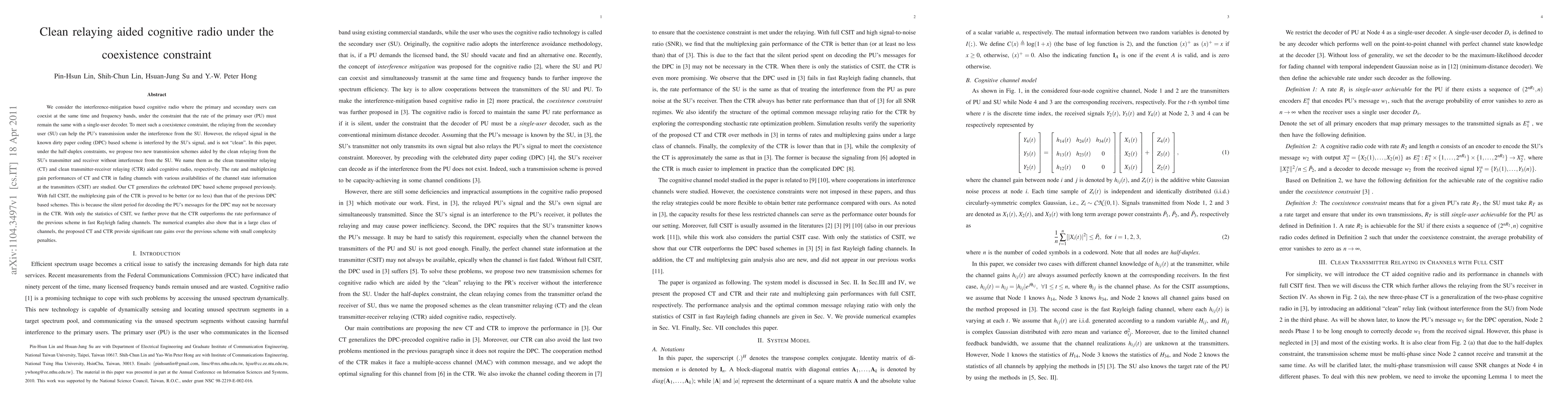 We consider the interference-mitigation based cognitive radio where the primary and secondary users can coexist at the same time and frequency bands, under the constraint that the rate of the primary user (PU) must remain the same with a single-user decoder. To meet such a coexistence constraint, the relaying from the secondary user (SU) can help the PU's transmission under the interference from the SU. However, the relayed signal in the known dirty paper coding (DPC) based scheme is interfered by the SU's signal, and is not "clean". In this paper, under the half-duplex constraints, we propose two new transmission schemes aided by the clean relaying from the SU's transmitter and receiver without interference from the SU. We name them as the clean transmitter relaying (CT) and clean transmitter-receiver relaying (CTR) aided cognitive radio, respectively. The rate and multiplexing gain performances of CT and CTR in fading channels with various availabilities of the channel state information at the transmitters (CSIT) are studied. Our CT generalizes the celebrated DPC based scheme proposed previously. With full CSIT, the multiplexing gain of the CTR is proved to be better (or no less) than that of the previous DPC based schemes. This is because the silent period for decoding the PU's messages for the DPC may not be necessary in the CTR. With only the statistics of CSIT, we further prove that the CTR outperforms the rate performance of the previous scheme in fast Rayleigh fading channels. The numerical examples also show that in a large class of channels, the proposed CT and CTR provide significant rate gains over the previous scheme with small complexity penalties.