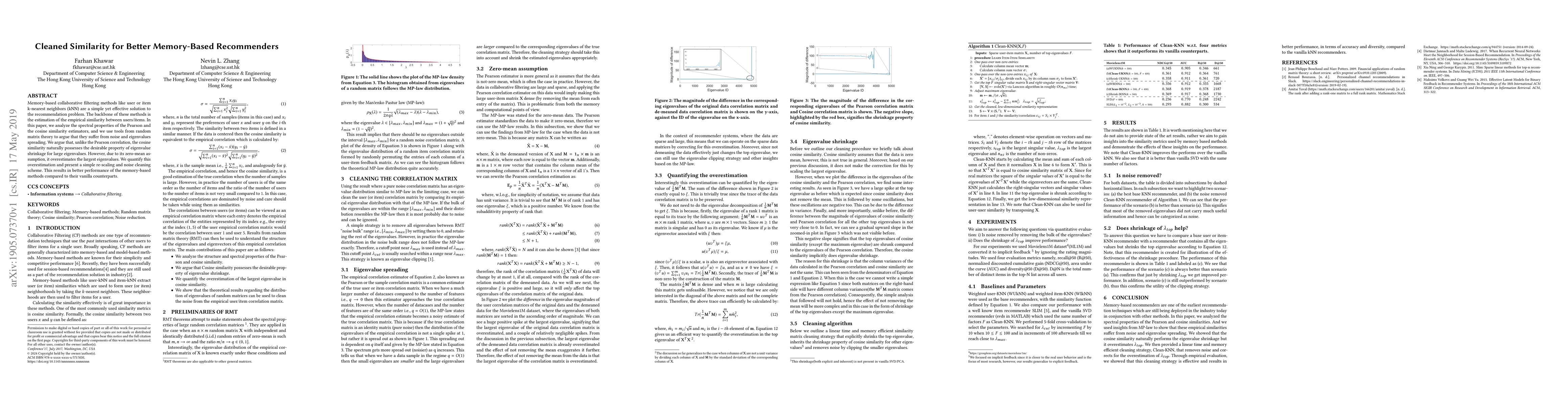 The paper presents a novel cleaning algorithm, Clean-KNN, that efficiently removes noise and corrects for eigenvalue overestimation in memory-based recommender systems, leading to improved performance in terms of accuracy and diversity.