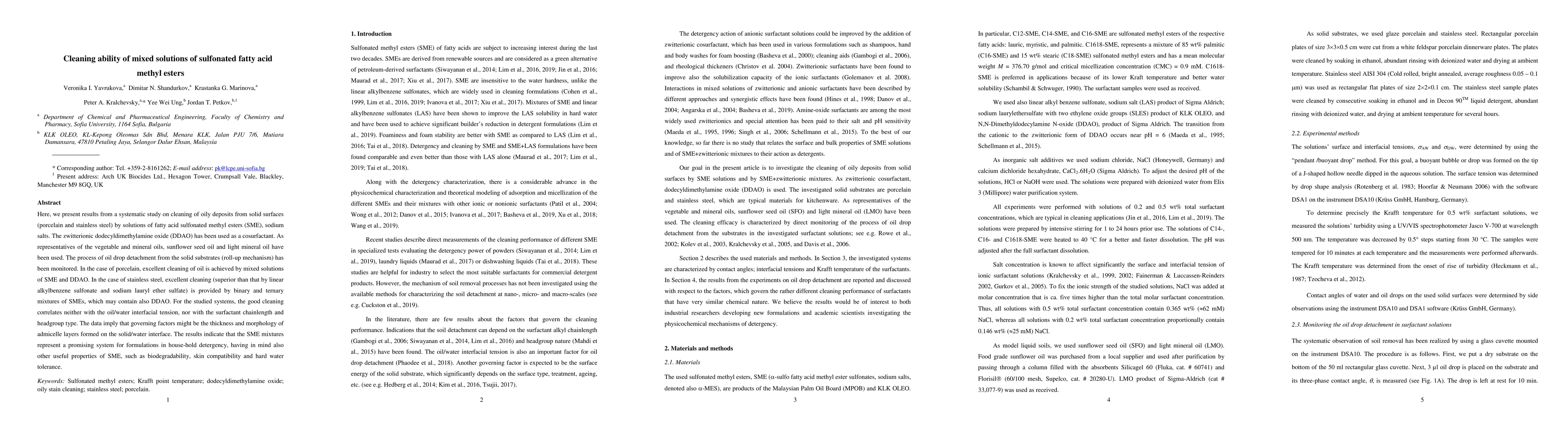 Here, we present results from a systematic study on cleaning of oily deposits from solid surfaces (porcelain and stainless steel) by solutions of fatty acid sulfonated methyl esters (SME), sodium salts. The zwitterionic dodecyldimethylamine oxide (DDAO) has been used as a cosurfactant. As representatives of the vegetable and mineral oils, sunflower seed oil and light mineral oil have been used. The process of oil drop detachment from the solid substrates (roll-up mechanism) has been monitored. In the case of porcelain, excellent cleaning of oil is achieved by mixed solutions of SME and DDAO. In the case of stainless steel, excellent cleaning (superior than that by linear alkylbenzene sulfonate and sodium lauryl ether sulfate) is provided by binary and ternary mixtures of SMEs, which may contain also DDAO. For the studied systems, the good cleaning correlates neither with the oil/water interfacial tension, nor with the surfactant chainlength and headgroup type. The data imply that governing factors might be the thickness and morphology of admicelle layers formed on the solid/water interface. The results indicate that the SME mixtures represent a promising system for formulations in house-hold detergency, having in mind also other useful properties of SME, such as biodegradability, skin compatibility and hard water tolerance.