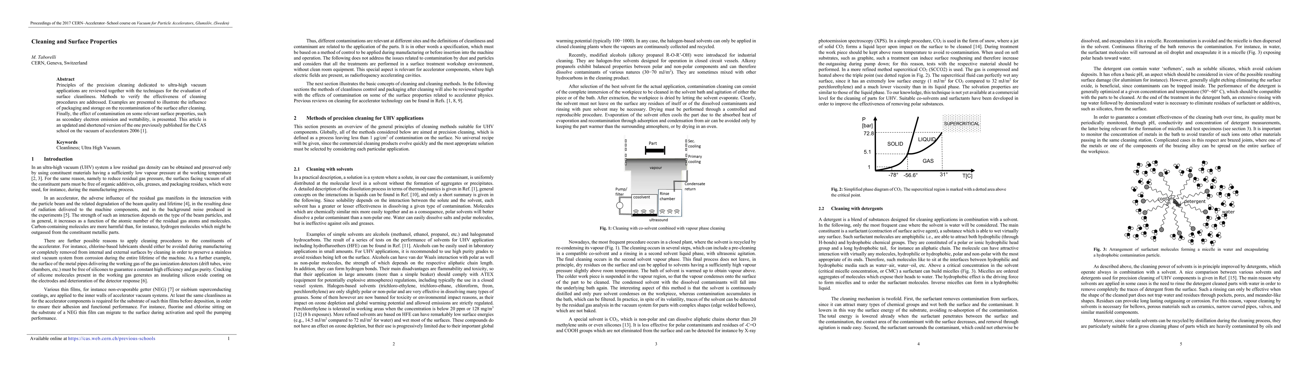 The paper reviews principles of precision cleaning for ultra-high vacuum applications, evaluates surface cleanliness techniques, and examines the impact of contamination on surface properties like secondary electron emission and wettability.