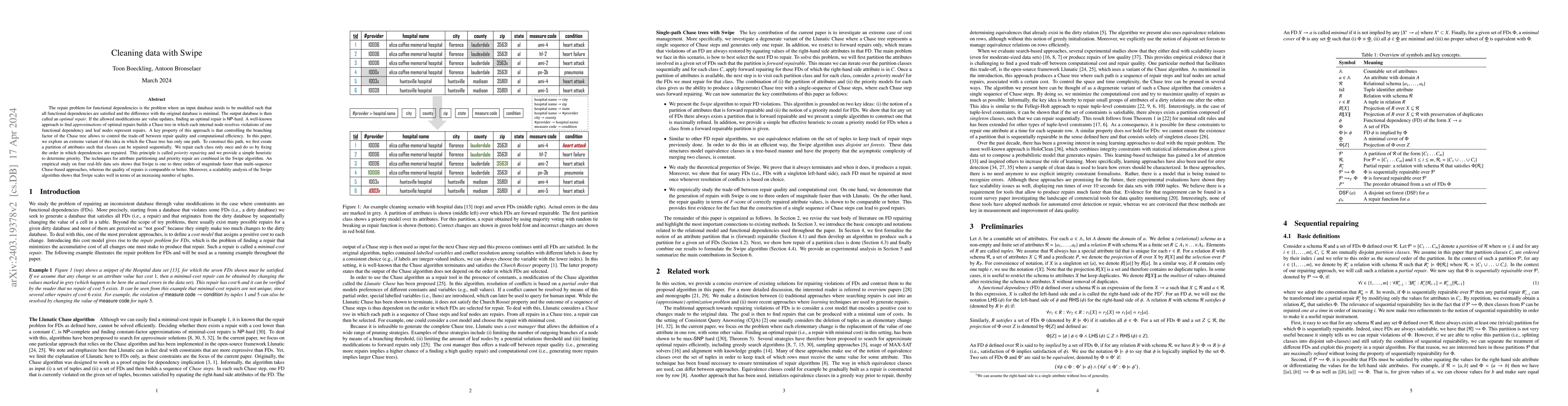 This paper introduces the Swipe algorithm for repairing functional dependencies in databases, achieving significant speed improvements over traditional Chase-based methods while maintaining comparable or better repair quality. By sequentially repairing attribute classes in a prioritized manner, Swipe constructs a single-path Chase tree, demonstrating scalability and efficiency on real-life datasets.