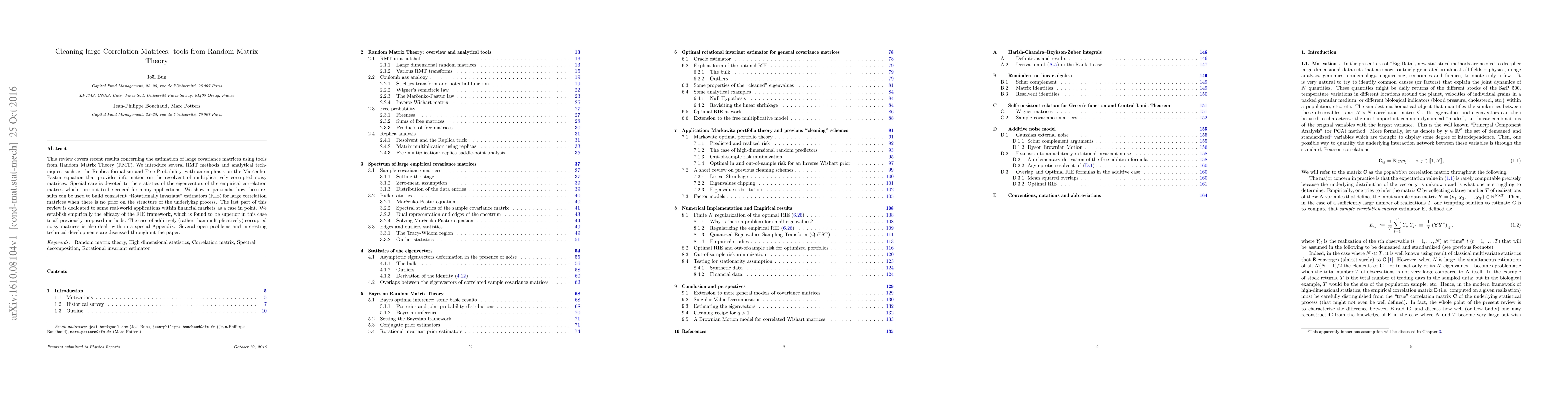 This paper reviews recent advancements in estimating large covariance matrices using Random Matrix Theory, focusing on methods like Replica formalism and Free Probability. It introduces Rotationally Invariant Estimators (RIE) for noisy matrices and demonstrates their superior efficacy in financial market applications compared to previous methods.