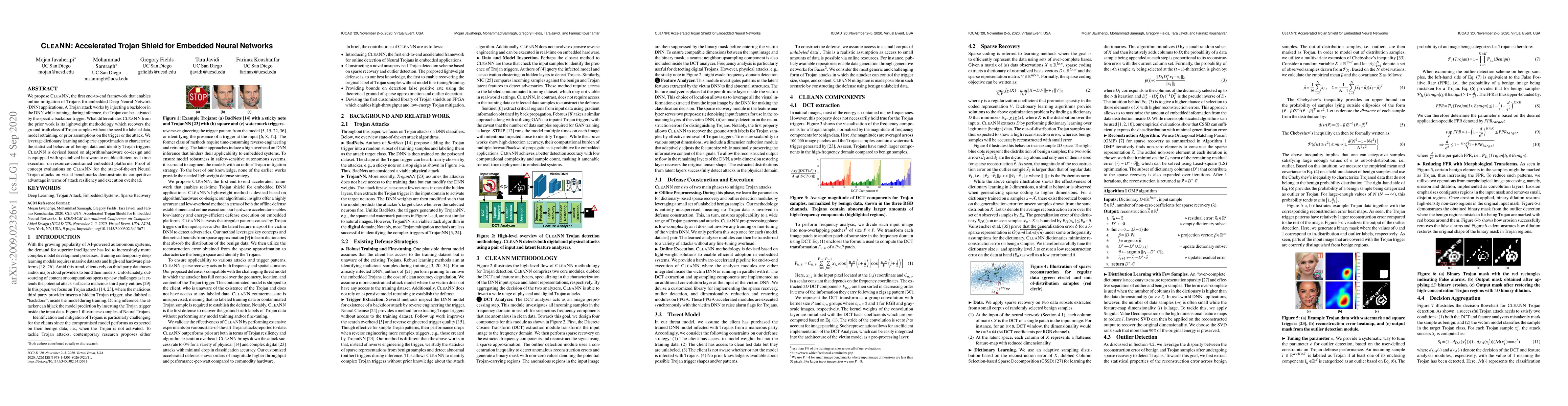 CLEANN is a novel framework for real-time Trojan mitigation in embedded DNNs, utilizing dictionary learning and sparse approximation to identify and neutralize Trojan triggers without labeled data or model retraining. It is designed for efficient execution on resource-constrained hardware, demonstrating competitive resiliency against state-of-the-art Neural Trojan attacks.
