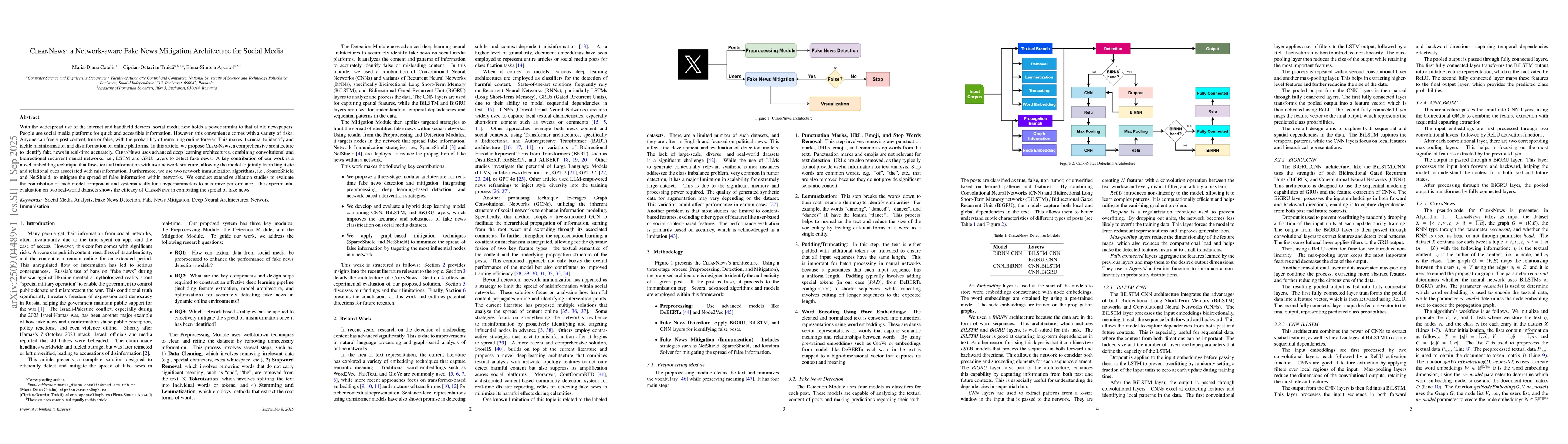 With the widespread use of the internet and handheld devices, social media now holds a power similar to that of old newspapers. People use social media platforms for quick and accessible information. However, this convenience comes with a variety of risks. Anyone can freely post content, true or false, with the probability of remaining online forever. This makes it crucial to identify and tackle misinformation and disinformation on online platforms. In this article, we propose CleanNews, a comprehensive architecture to identify fake news in real-time accurately. CleanNews uses advanced deep learning architectures, combining convolutional and bidirectional recurrent neural networks, i.e., LSTM and GRU, layers to detect fake news. A key contribution of our work is a novel embedding technique that fuses textual information with user network structure, allowing the model to jointly learn linguistic and relational cues associated with misinformation. Furthermore, we use two network immunization algorithms, i.e., SparseShield and NetShield, to mitigate the spread of false information within networks. We conduct extensive ablation studies to evaluate the contribution of each model component and systematically tune hyperparameters to maximize performance. The experimental evaluation on two real-world datasets shows the efficacy of CleanNews in combating the spread of fake news.