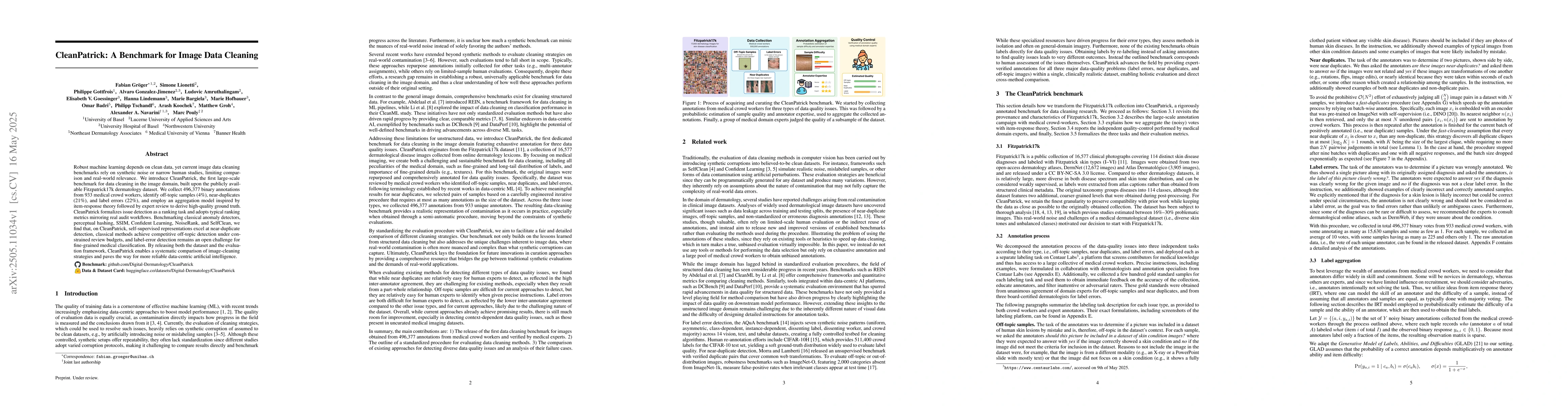 The research introduces CleanPatrick, a large-scale benchmark for image data cleaning, built on the Fitzpatrick17k dermatology dataset. It involves collecting annotations from 933 medical crowd workers to identify off-topic samples, near-duplicates, and label errors, followed by an aggregation model and expert review to establish ground truth.