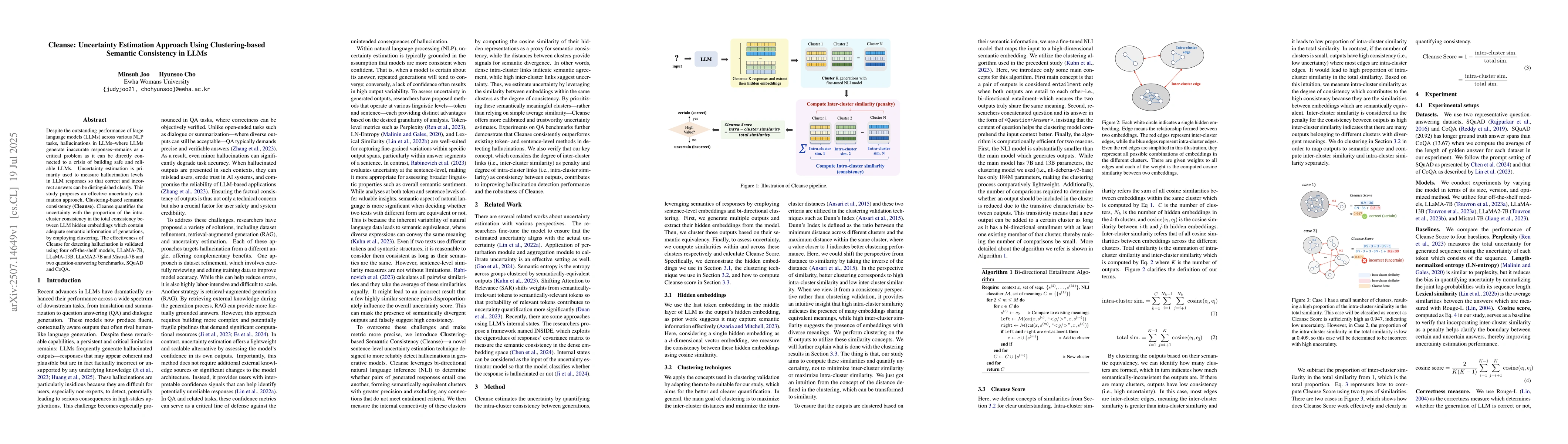 Despite the outstanding performance of large language models (LLMs) across various NLP tasks, hallucinations in LLMs--where LLMs generate inaccurate responses--remains as a critical problem as it can be directly connected to a crisis of building safe and reliable LLMs. Uncertainty estimation is primarily used to measure hallucination levels in LLM responses so that correct and incorrect answers can be distinguished clearly. This study proposes an effective uncertainty estimation approach, \textbf{Cl}ust\textbf{e}ring-based sem\textbf{an}tic con\textbf{s}ist\textbf{e}ncy (\textbf{Cleanse}). Cleanse quantifies the uncertainty with the proportion of the intra-cluster consistency in the total consistency between LLM hidden embeddings which contain adequate semantic information of generations, by employing clustering. The effectiveness of Cleanse for detecting hallucination is validated using four off-the-shelf models, LLaMA-7B, LLaMA-13B, LLaMA2-7B and Mistral-7B and two question-answering benchmarks, SQuAD and CoQA.