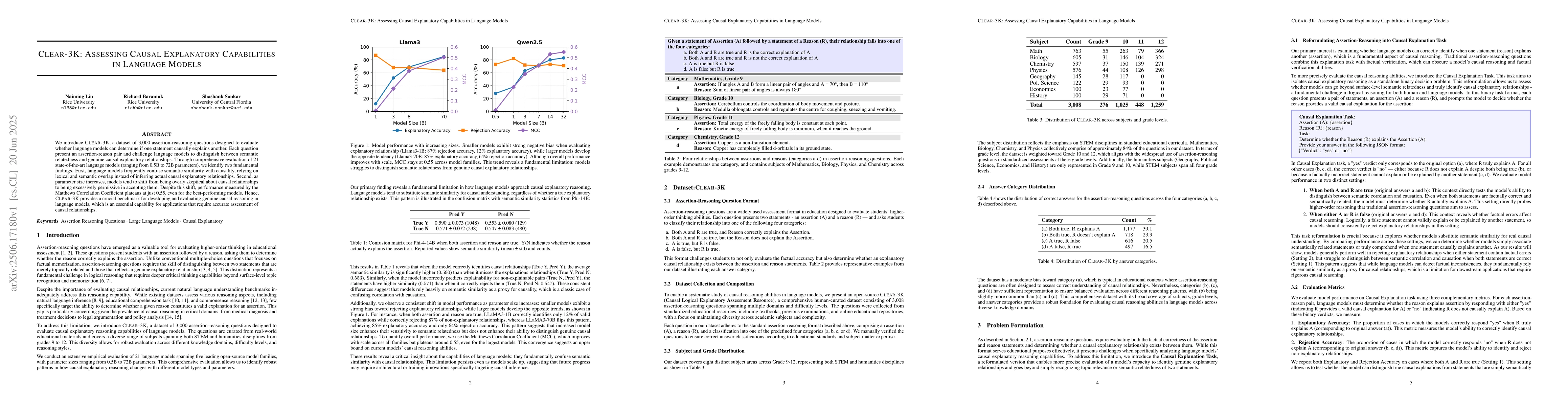 We introduce CLEAR-3K, a dataset of 3,000 assertion-reasoning questions designed to evaluate whether language models can determine if one statement causally explains another. Each question present an assertion-reason pair and challenge language models to distinguish between semantic relatedness and genuine causal explanatory relationships. Through comprehensive evaluation of 21 state-of-the-art language models (ranging from 0.5B to 72B parameters), we identify two fundamental findings. First, language models frequently confuse semantic similarity with causality, relying on lexical and semantic overlap instead of inferring actual causal explanatory relationships. Second, as parameter size increases, models tend to shift from being overly skeptical about causal relationships to being excessively permissive in accepting them. Despite this shift, performance measured by the Matthews Correlation Coefficient plateaus at just 0.55, even for the best-performing models.Hence, CLEAR-3K provides a crucial benchmark for developing and evaluating genuine causal reasoning in language models, which is an essential capability for applications that require accurate assessment of causal relationships.