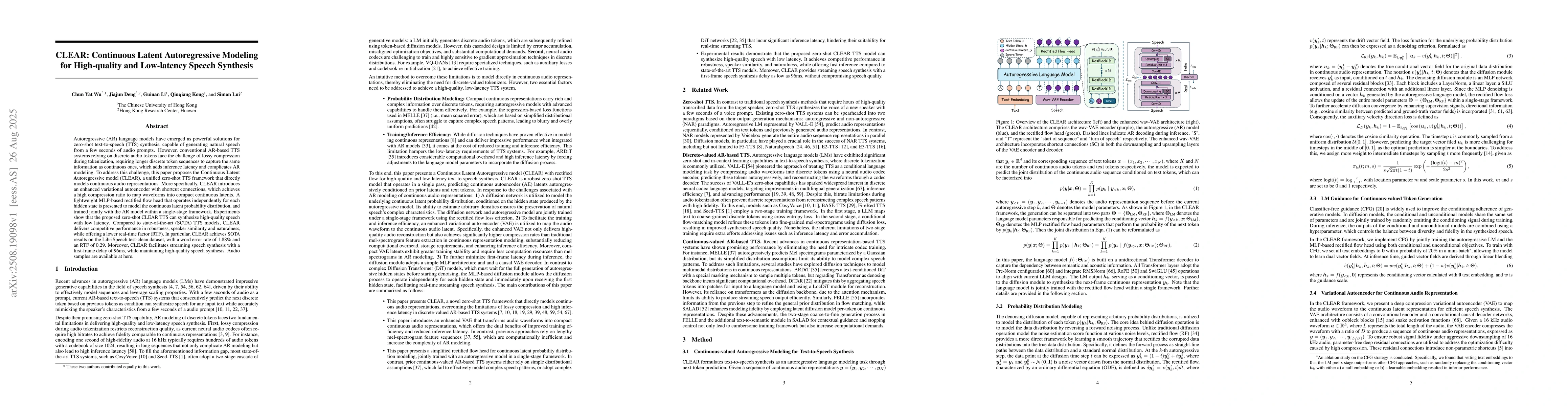 Autoregressive (AR) language models have emerged as powerful solutions for zero-shot text-to-speech (TTS) synthesis, capable of generating natural speech from a few seconds of audio prompts. However, conventional AR-based TTS systems relying on discrete audio tokens face the challenge of lossy compression during tokenization, requiring longer discrete token sequences to capture the same information as continuous ones, which adds inference latency and complicates AR modeling. To address this challenge, this paper proposes the Continuous Latent Autoregressive model (CLEAR), a unified zero-shot TTS framework that directly models continuous audio representations. More specifically, CLEAR introduces an enhanced variational autoencoder with shortcut connections, which achieves a high compression ratio to map waveforms into compact continuous latents. A lightweight MLP-based rectified flow head that operates independently for each hidden state is presented to model the continuous latent probability distribution, and trained jointly with the AR model within a single-stage framework. Experiments show that the proposed zero-shot CLEAR TTS can synthesize high-quality speech with low latency. Compared to state-of-the-art (SOTA) TTS models, CLEAR delivers competitive performance in robustness, speaker similarity and naturalness, while offering a lower real-time factor (RTF). In particular, CLEAR achieves SOTA results on the LibriSpeech test-clean dataset, with a word error rate of 1.88\% and an RTF of 0.29. Moreover, CLEAR facilitates streaming speech synthesis with a first-frame delay of 96ms, while maintaining high-quality speech synthesis.