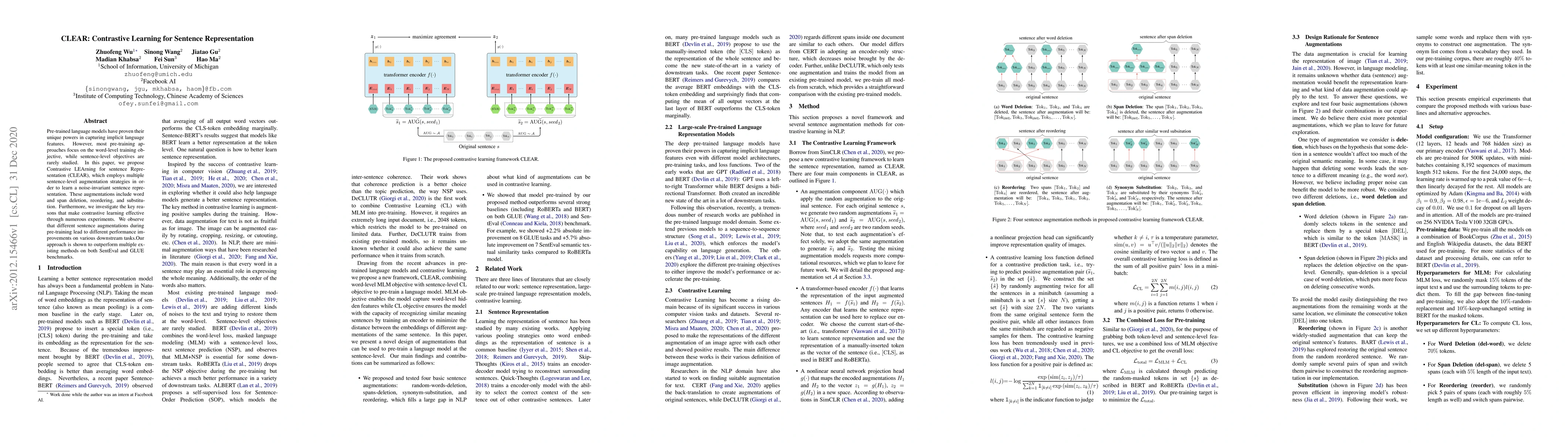 This paper introduces CLEAR, a method for learning sentence representations through contrastive learning using various sentence-level augmentations. It demonstrates superior performance on SentEval and GLUE benchmarks compared to existing methods, highlighting the effectiveness of different augmentation strategies.