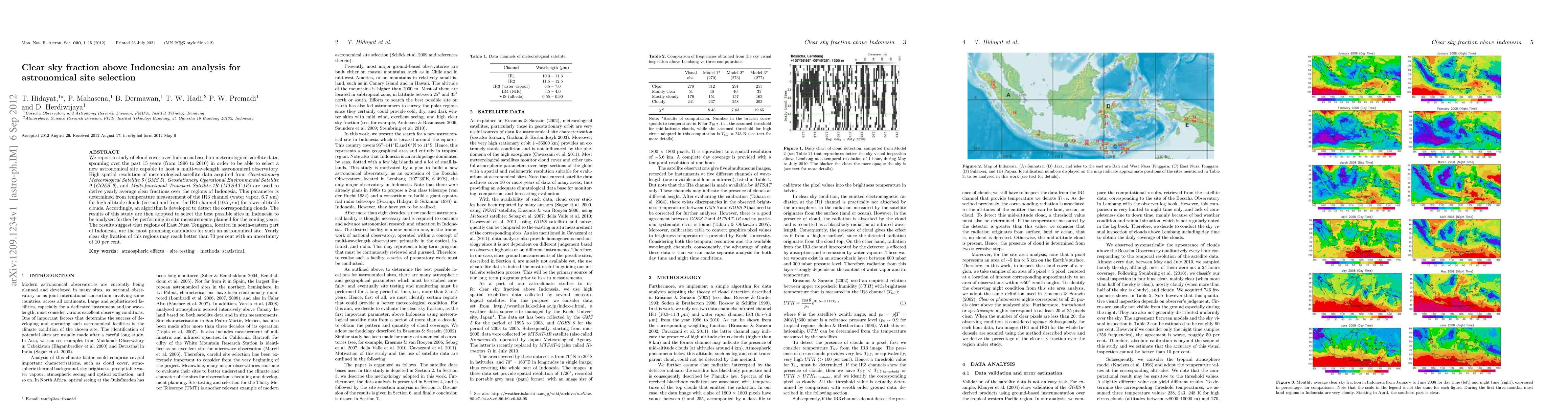 This study analyzes cloud cover over Indonesia using satellite data from 1996 to 2010 to identify suitable sites for a multi-wavelength astronomical observatory. Regions in East Nusa Tenggara show the highest clear sky fraction, potentially exceeding 70 percent annually.