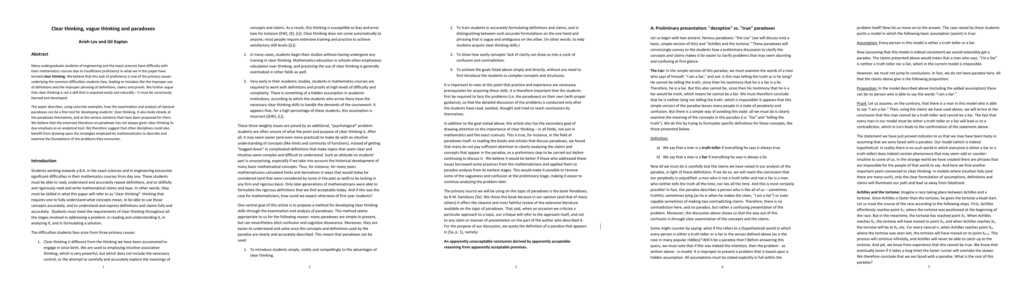 This paper argues that insufficient proficiency in clear thinking is a major cause of mathematics-related difficulties among engineering and science undergraduates. It proposes that examining and analyzing classical paradoxes can effectively develop students' clear thinking, emphasizing that this skill must be consciously learned rather than acquired naturally.