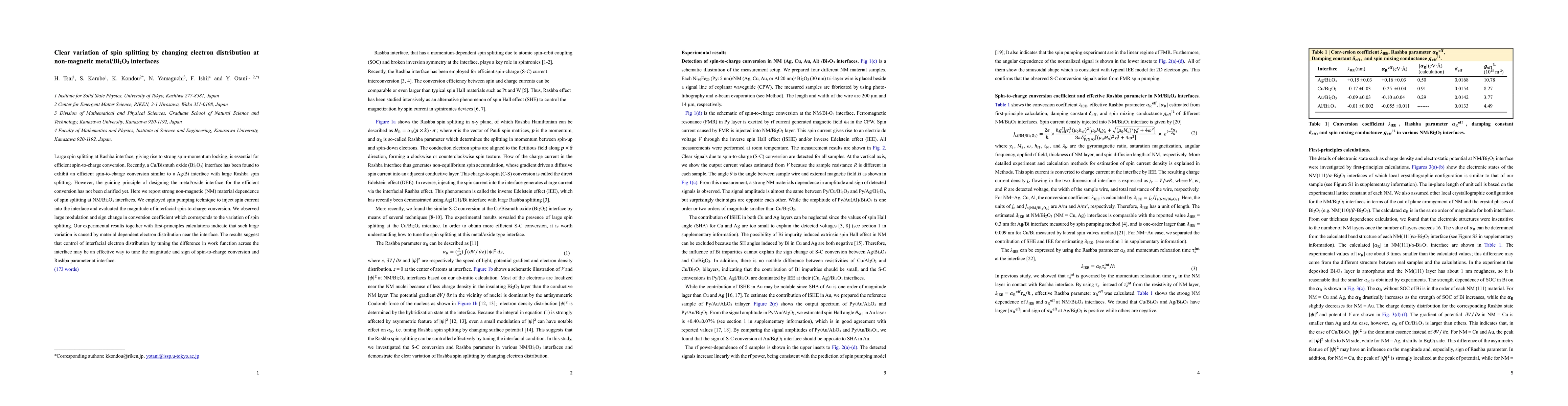 This paper demonstrates that the spin splitting at non-magnetic metal/Bi2O3 interfaces can be significantly varied by adjusting the electron distribution, which influences the spin-to-charge conversion efficiency. The study suggests that tuning the work function difference across the interface can effectively modulate the spin-to-charge conversion and Rashba parameter.