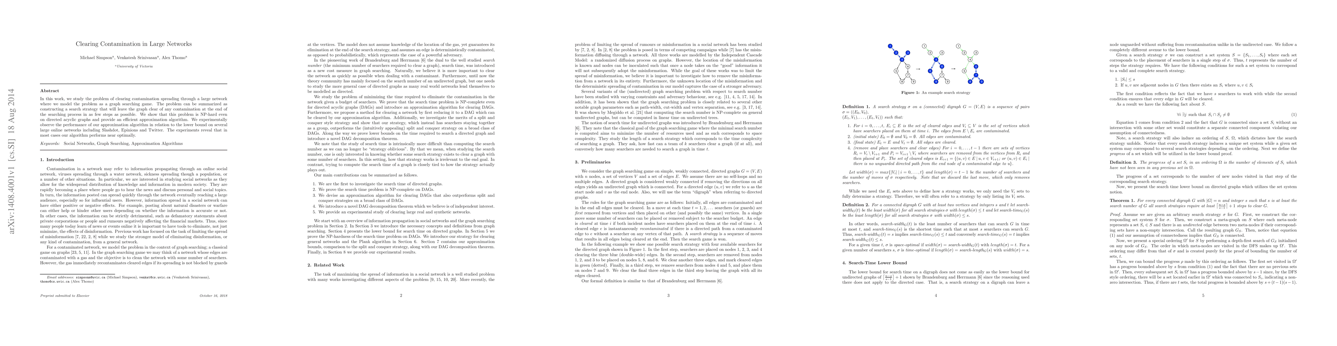 In this work, we study the problem of clearing contamination spreading through a large network where we model the problem as a graph searching game. The problem can be summarized as constructing a search strategy that will leave the graph clear of any contamination at the end of the searching process in as few steps as possible. We show that this problem is NP-hard even on directed acyclic graphs and provide an efficient approximation algorithm. We experimentally observe the performance of our approximation algorithm in relation to the lower bound on several large online networks including Slashdot, Epinions and Twitter. The experiments reveal that in most cases our algorithm performs near optimally.
