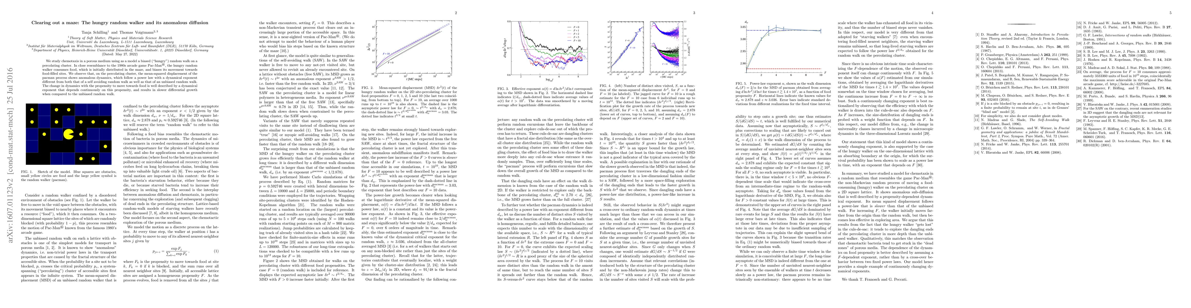This research investigates chemotaxis via a 'hungry' random walker model on a percolating cluster, akin to Pac-Man. The walker's movement towards food results in anomalous diffusion, with a power-law mean-squared displacement and a unique dynamical exponent, distinct from unbiased walks.