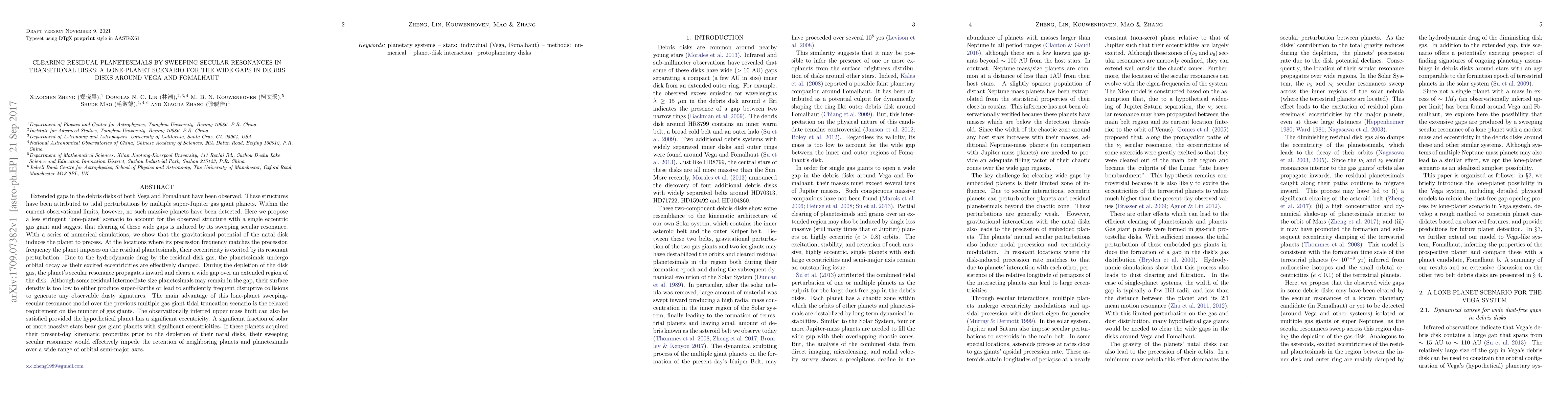 This paper proposes a "lone-planet" scenario to explain the wide gaps in the debris disks of Vega and Fomalhaut, suggesting that a single eccentric gas giant sweeping secular resonance can clear these gaps without requiring multiple super-Jupiter planets. This model relaxes the need for numerous gas giants and can satisfy observational constraints.