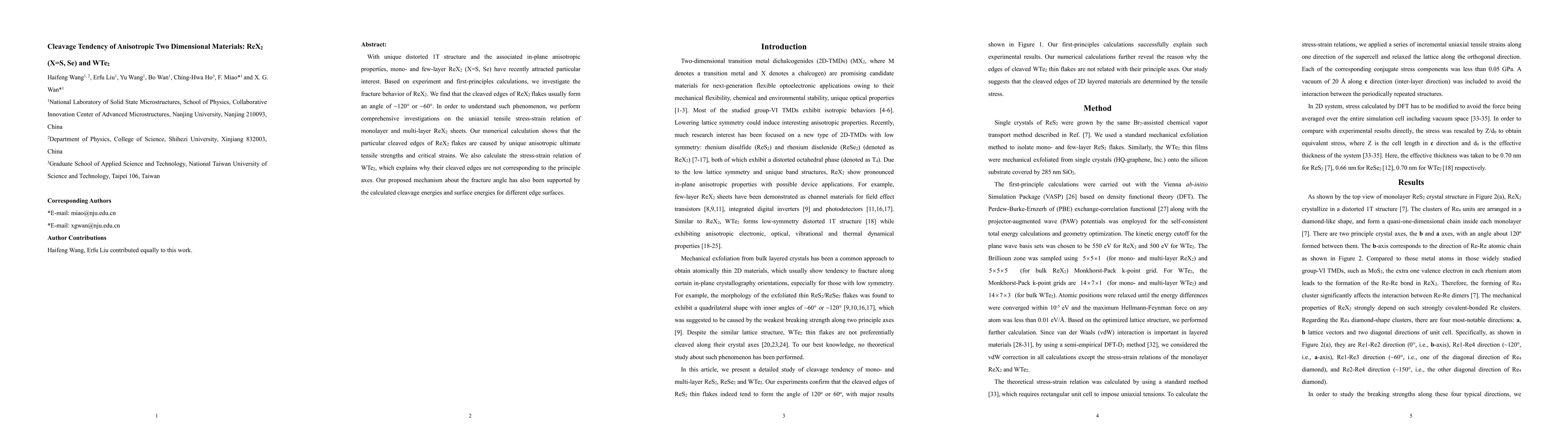 With unique distorted 1T structure and the associated in-plane anisotropic properties, mono- and few-layer ReX2 (X=S, Se) have recently attracted particular interest. Based on experiment and first-principles calculations, we investigate the fracture behavior of ReX2. We find that the cleaved edges of ReX2 flakes usually form an angle of ~120{\deg} or ~60{\deg}. In order to understand such phenomenon, we perform comprehensive investigations on the uniaxial tensile stress-strain relation of monolayer and multi-layer ReX2 sheets. Our numerical calculation shows that the particular cleaved edges of ReX2 flakes are caused by unique anisotropic ultimate tensile strengths and critical strains. We also calculate the stress-strain relation of WTe2, which explains why their cleaved edges are not corresponding to the principle axes. Our proposed mechanism about the fracture angle has also been supported by the calculated cleavage energies and surface energies for different edge surfaces.