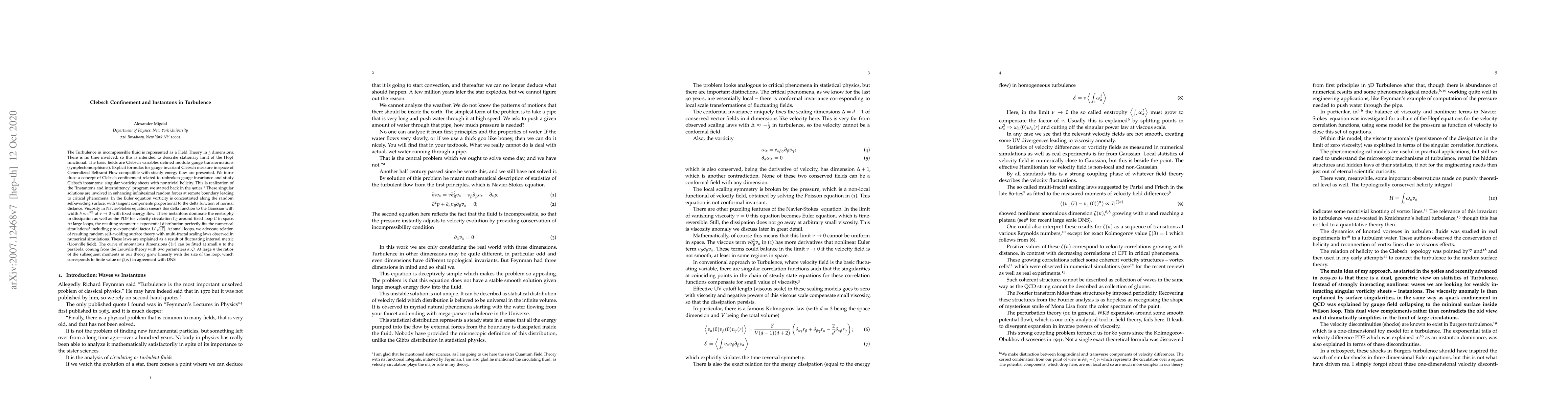 This paper introduces Clebsch confinement and studies Clebsch instantons, singular vorticity sheets with nontrivial helicity, to understand turbulence. Instantons enhance random forces, leading to critical phenomena and dominate enstrophy in dissipation, fitting well with numerical simulations.