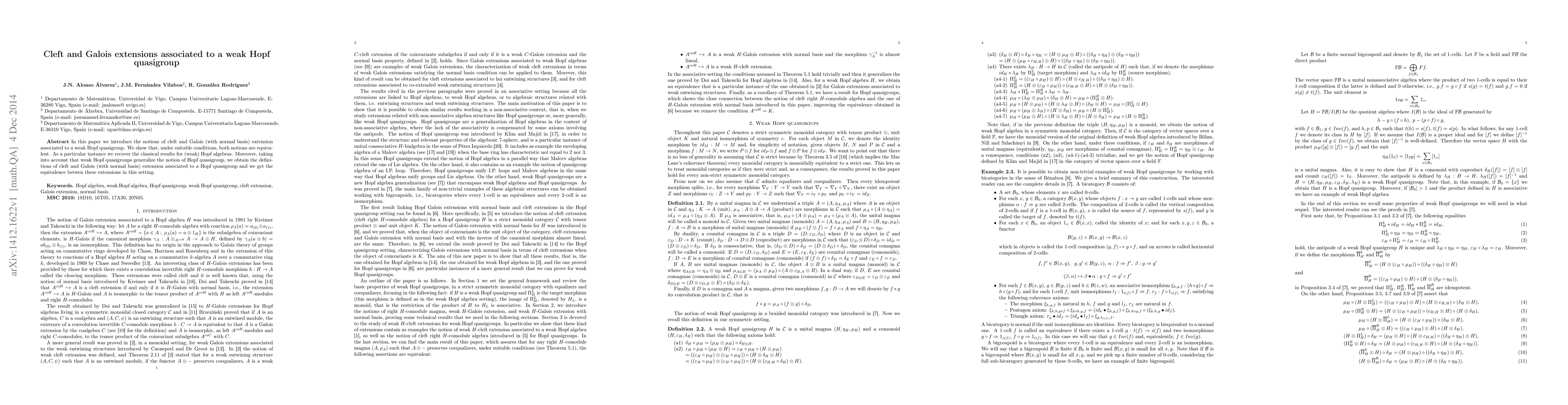 In this paper we introduce the notions of cleft and Galois (with normal basis) extension associated to a weak Hopf quasigroup. We show that, under suitable conditions, both notions are equivalent. As a particular instance we recover the classical results for (weak) Hopf algebras. Moreover, taking into account that weak Hopf quasigroups generalize the notion of Hopf quasigroup, we obtain the definitions of cleft and Galois (with normal basis) extension associated to a Hopf quasigroup and we get the equivalence betwen these extensions in this setting.