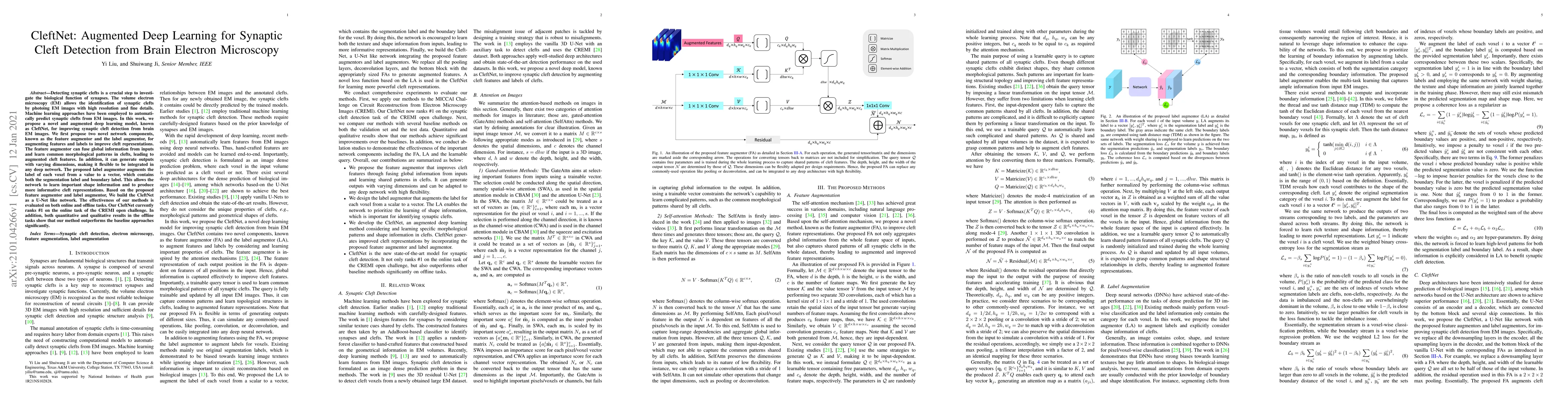 CleftNet is an augmented deep learning model designed to improve synaptic cleft detection in brain electron microscopy images. It incorporates two novel components, the feature augmentor and label augmentor, to enhance feature representations and label information, respectively, leading to superior cleft detection performance.