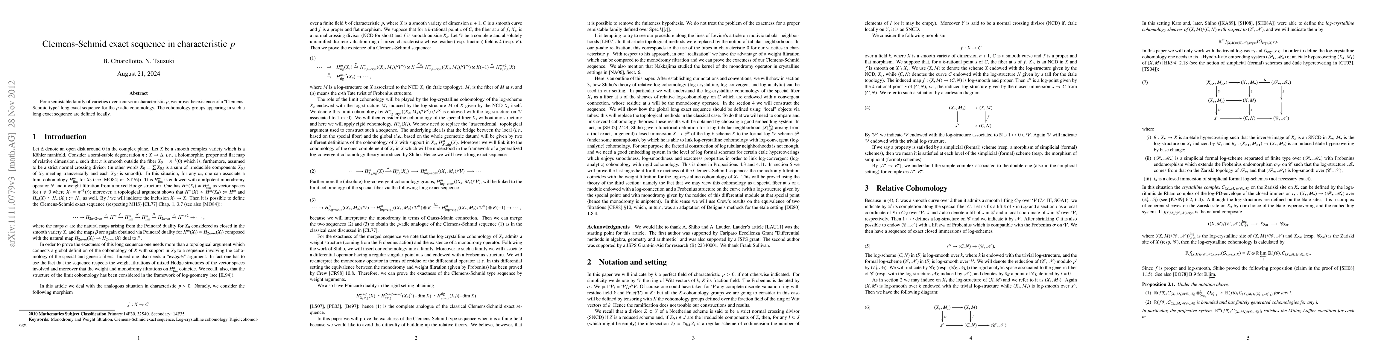 The paper proves the existence of a "Clemens-Schmid type" long exact sequence for $p$-adic cohomology in semistable families of varieties over a curve in characteristic $p$, with locally defined cohomology groups. This establishes a new exact sequence analogous to the Clemens-Schmid sequence in this characteristic $p$ setting.