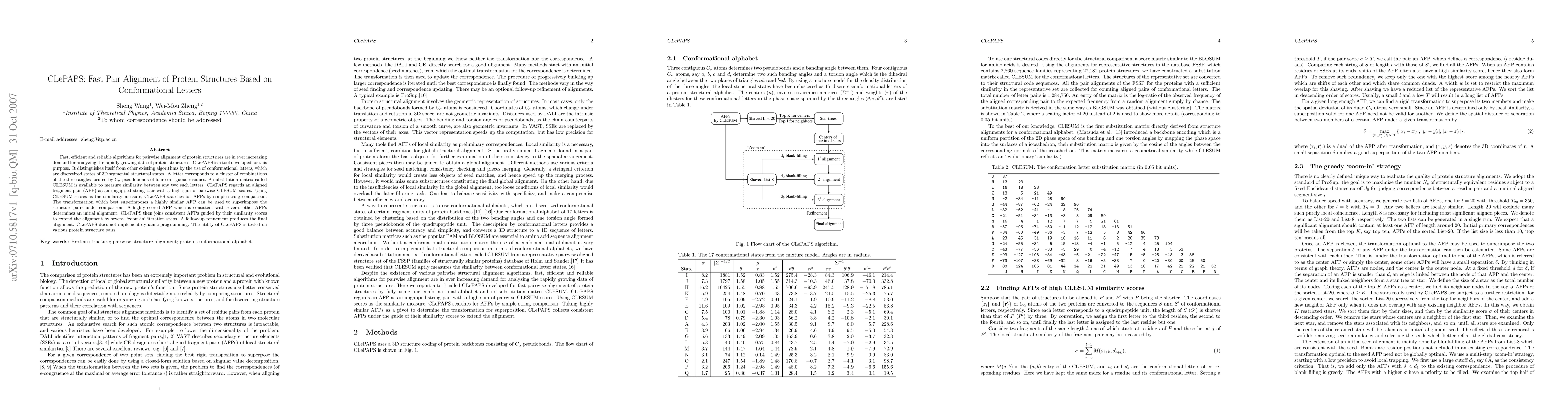 CLePAPS is a fast algorithm for aligning protein structures using conformational letters, which represent discretized 3D segmental states, and a CLESUM substitution matrix for similarity measurement. It iteratively extends initial alignments based on high-scoring fragment pairs, achieving efficient and reliable pairwise alignments without dynamic programming.