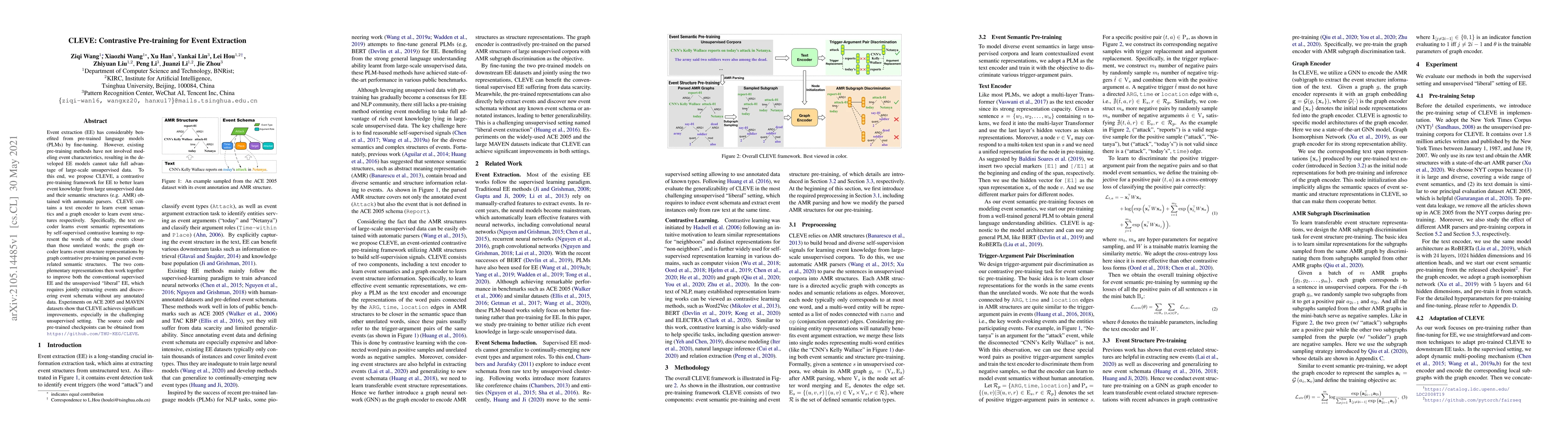 CLEVE introduces a contrastive pre-training framework for event extraction that leverages both text and graph encoders to learn event semantics and structures from large-scale unsupervised data. This approach significantly enhances both supervised and unsupervised event extraction, particularly in the latter setting, as demonstrated by improved performance on ACE 2005 and MAVEN datasets.
