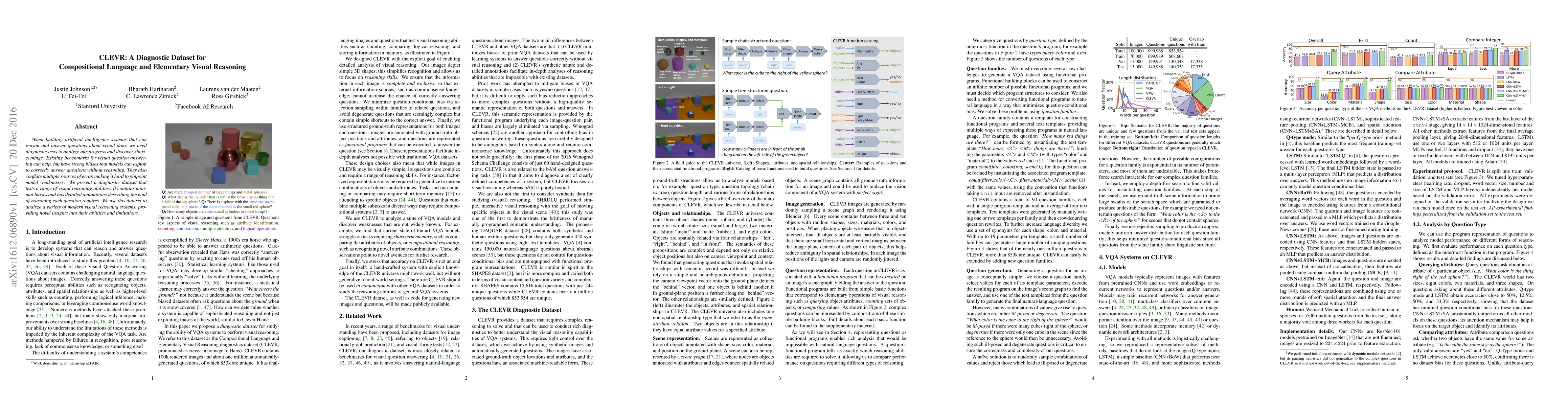 CLEVR is a diagnostic dataset designed to evaluate and pinpoint the strengths and weaknesses of visual reasoning systems. It minimizes biases and provides detailed annotations for analyzing model performance across various reasoning tasks.