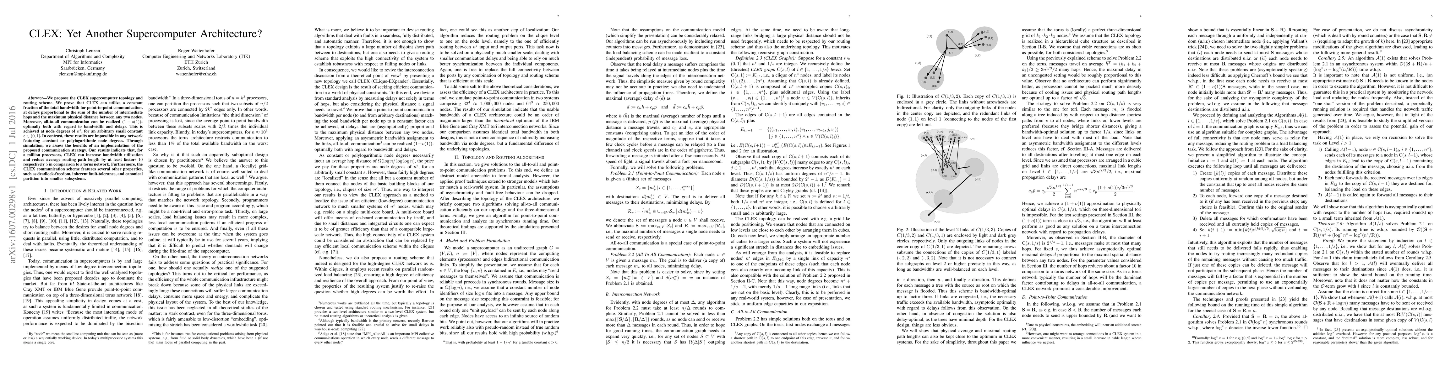 The CLEX supercomputer architecture proposes an innovative topology and routing scheme that maximizes bandwidth utilization and minimizes delays, achieving near-optimal all-to-all communication. Simulation results show significant improvements over torus networks, including a tenfold increase in bandwidth and a fivefold reduction in average path length.