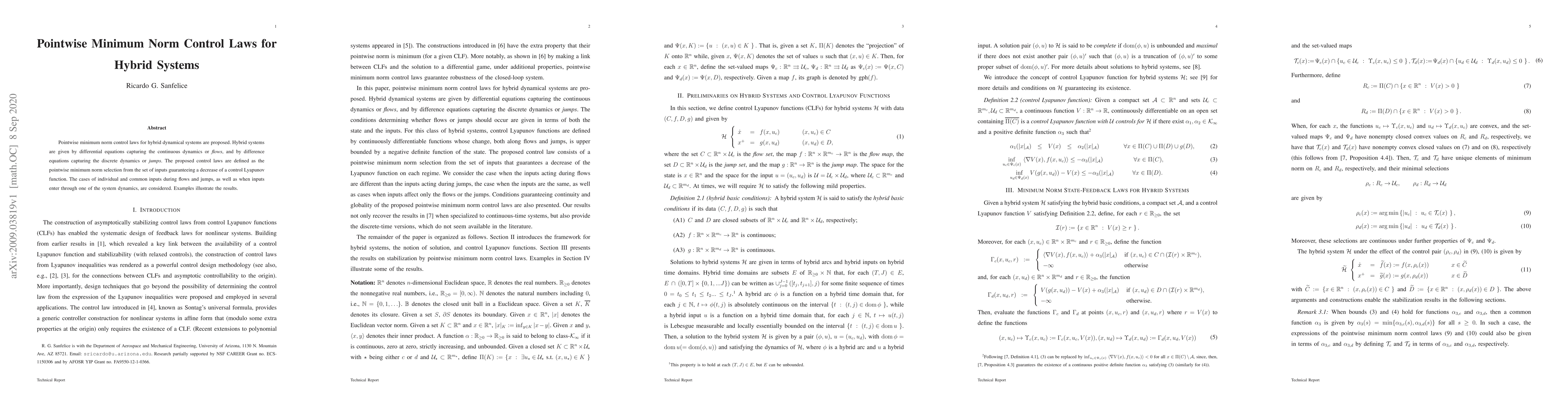 This paper proposes pointwise minimum norm control laws for hybrid dynamical systems, utilizing control Lyapunov functions to ensure stability. The control laws select inputs that guarantee a decrease in the Lyapunov function, considering both individual and common inputs during continuous and discrete dynamics.