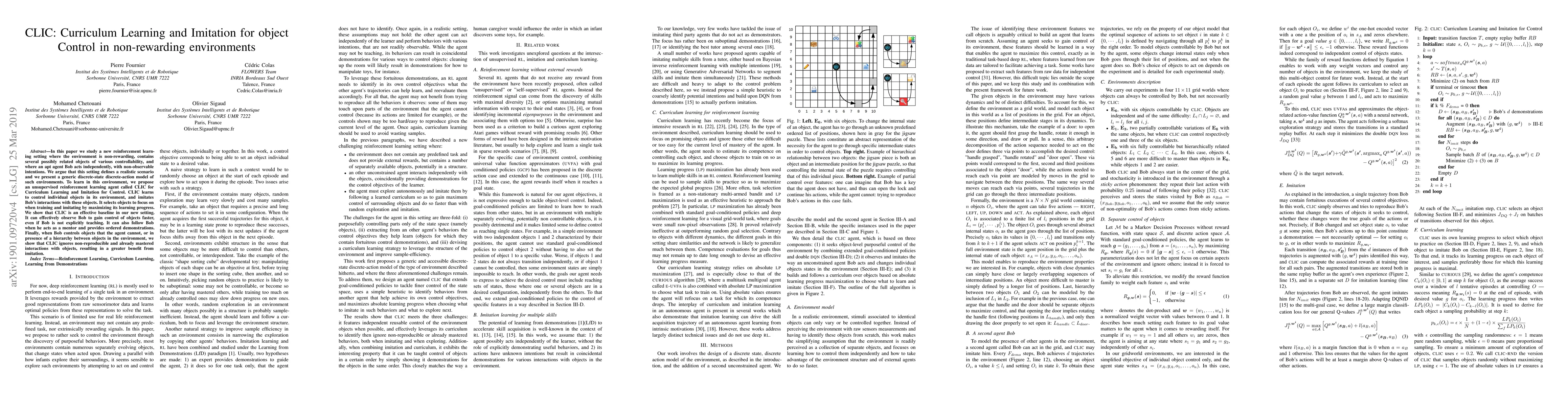 The research proposes a new reinforcement learning setting in non-rewarding environments with multiple objects of varying controllability, where an independent agent Bob acts without explicit teaching. The CLIC agent learns through curriculum learning and imitation, focusing on objects that maximize learning progress.