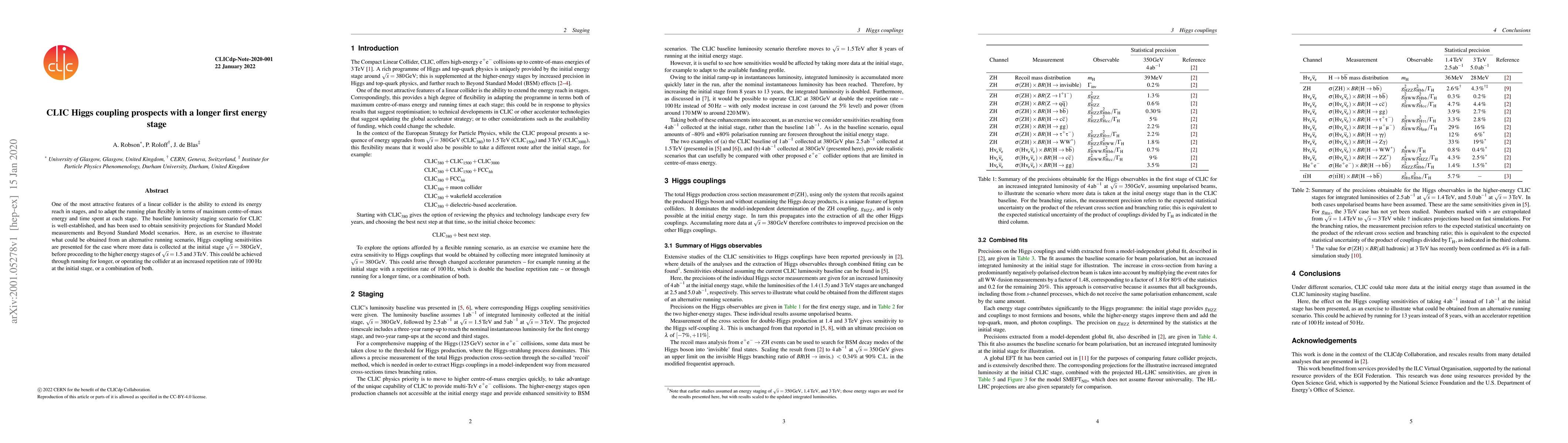 One of the most attractive features of a linear collider is the ability to extend its energy reach in stages, and to adapt the running plan flexibly in terms of maximum centre-of-mass energy and time spent at each stage. The baseline luminosity staging scenario for CLIC is well-established, and has been used to obtain sensitivity projections for Standard Model measurements and Beyond Standard Model scenarios. Here, as an exercise to illustrate what could be obtained from an alternative running scenario, Higgs coupling sensitivities are presented for the case where more data is collected at the initial stage $\sqrt{s}=380$ GeV, before proceeding to the higher energy stages of $\sqrt{s}=1.5$ and 3 TeV. This could be achieved through running for longer, or operating the collider at an increased repetition rate of 100 Hz at the initial stage, or a combination of both.