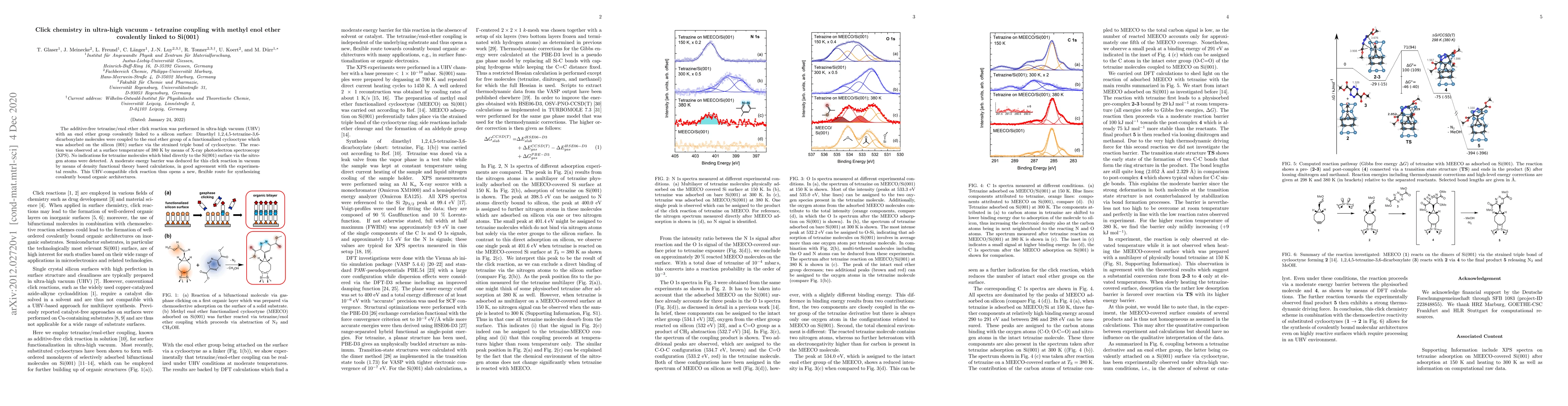 The additive-free tetrazine/enol ether click reaction was performed in ultra-high vacuum (UHV) with an enol ether group covalently linked to a silicon surface: Dimethyl 1,2,4,5-tetrazine-3,6-dicarboxylate molecules were coupled to the enol ether group of a functionalized cyclooctyne which was adsorbed on the silicon (001) surface via the strained triple bond of cyclooctyne. The reaction was observed at a surface temperature of 380 K by means of X-ray photoelectron spectroscopy (XPS). No indications for tetrazine molecules which bind directly to the Si(001) surface via the nitrogen atoms were detected. A moderate energy barrier was deduced for this click reaction in vacuum by means of density functional theory based calculations, in good agreement with the experimental results. This UHV-compatible click reaction thus opens a new, flexible route for synthesizing covalently bound organic architectures.