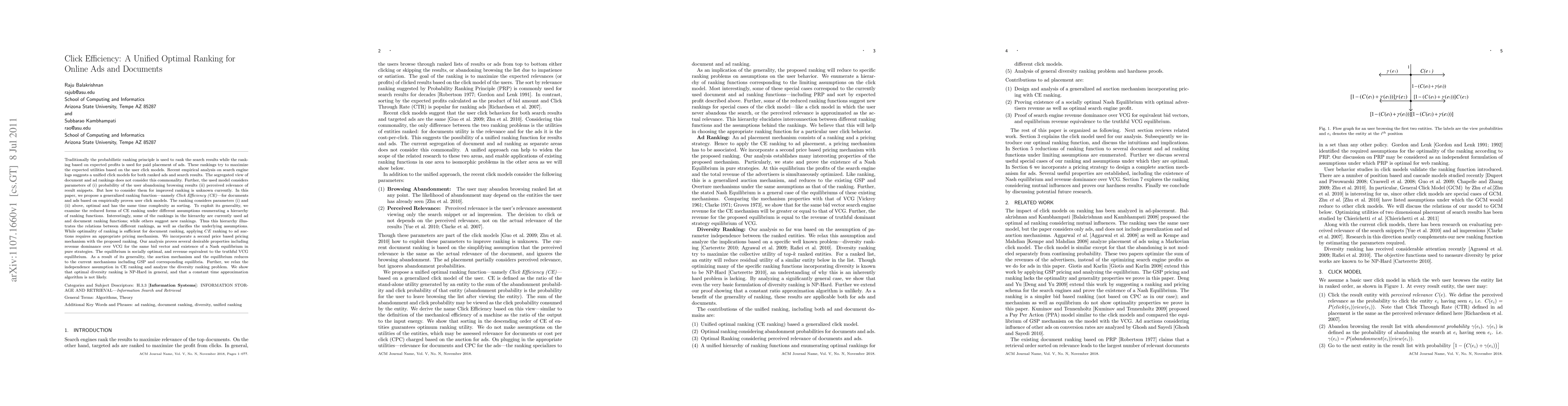 Traditionally the probabilistic ranking principle is used to rank the search results while the ranking based on expected profits is used for paid placement of ads. These rankings try to maximize the expected utilities based on the user click models. Recent empirical analysis on search engine logs suggests a unified click models for both ranked ads and search results. The segregated view of document and ad rankings does not consider this commonality. Further, the used models consider parameters of (i) probability of the user abandoning browsing results (ii) perceived relevance of result snippets. But how to consider them for improved ranking is unknown currently. In this paper, we propose a generalized ranking function---namely "Click Efficiency (CE)"---for documents and ads based on empirically proven user click models. The ranking considers parameters (i) and (ii) above, optimal and has the same time complexity as sorting. To exploit its generality, we examine the reduced forms of CE ranking under different assumptions enumerating a hierarchy of ranking functions. Some of the rankings in the hierarchy are currently used ad and document ranking functions; while others suggest new rankings. While optimality of ranking is sufficient for document ranking, applying CE ranking to ad auctions requires an appropriate pricing mechanism. We incorporate a second price based pricing mechanism with the proposed ranking. Our analysis proves several desirable properties including revenue dominance over VCG for the same bid vector and existence of a Nash Equilibrium in pure strategies. The equilibrium is socially optimal, and revenue equivalent to the truthful VCG equilibrium. Further, we relax the independence assumption in CE ranking and analyze the diversity ranking problem. We show that optimal diversity ranking is NP-Hard in general, and that a constant time approximation is unlikely.