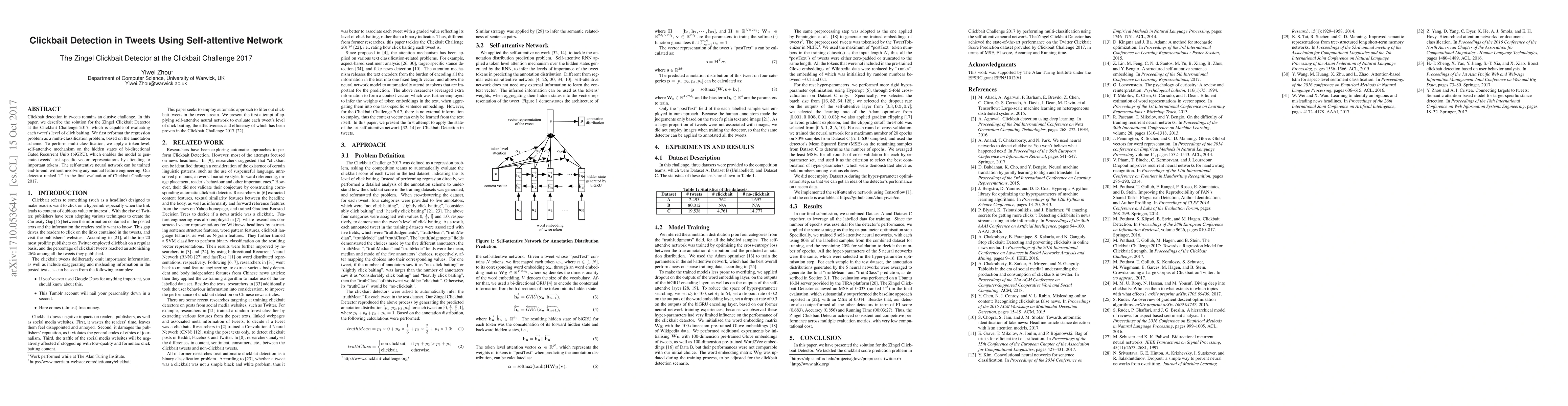 Clickbait detection in tweets remains an elusive challenge. In this paper, we describe the solution for the Zingel Clickbait Detector at the Clickbait Challenge 2017, which is capable of evaluating each tweet's level of click baiting. We first reformat the regression problem as a multi-classification problem, based on the annotation scheme. To perform multi-classification, we apply a token-level, self-attentive mechanism on the hidden states of bi-directional Gated Recurrent Units (biGRU), which enables the model to generate tweets' task-specific vector representations by attending to important tokens. The self-attentive neural network can be trained end-to-end, without involving any manual feature engineering. Our detector ranked first in the final evaluation of Clickbait Challenge 2017.