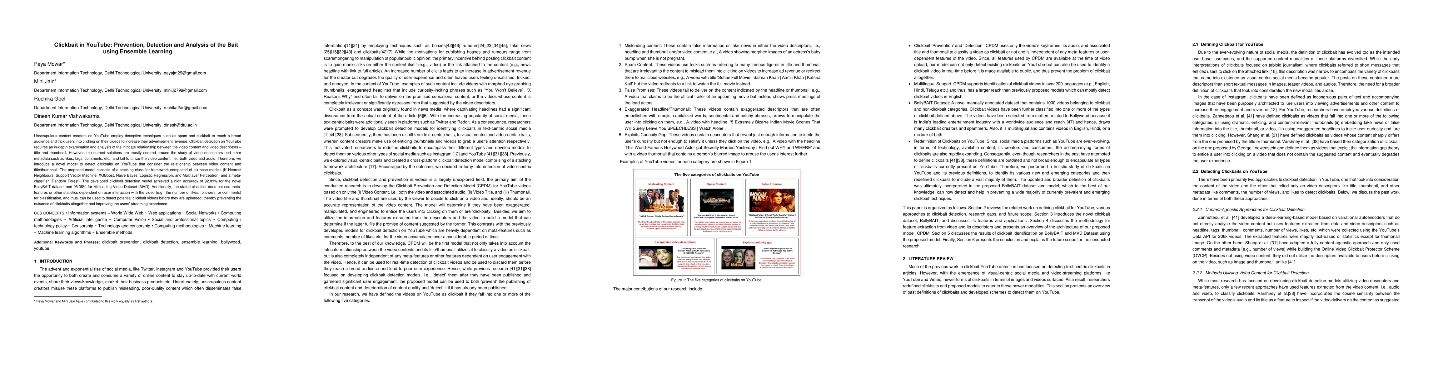 This paper proposes an ensemble learning model for detecting clickbait on YouTube by analyzing the relationship between video content and metadata like titles and thumbnails. The model, composed of six base classifiers and a meta classifier, achieved high accuracy rates on two datasets, and notably does not rely on user interaction metrics, enabling preemptive clickbait detection.