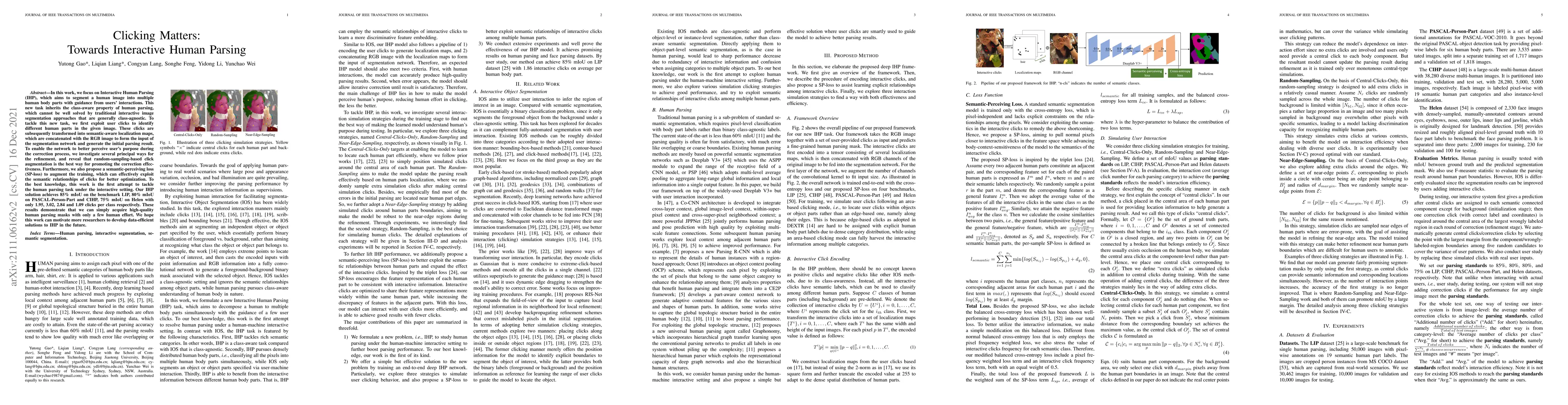 This paper introduces Interactive Human Parsing (IHP), a novel approach to segment human body parts using minimal user interactions, achieving high accuracy with only a few clicks. The method leverages user clicks to generate semantic-aware localization maps, which are refined through click augmentation and a proposed semantic-perceiving loss, resulting in impressive mIoU on multiple benchmarks.
