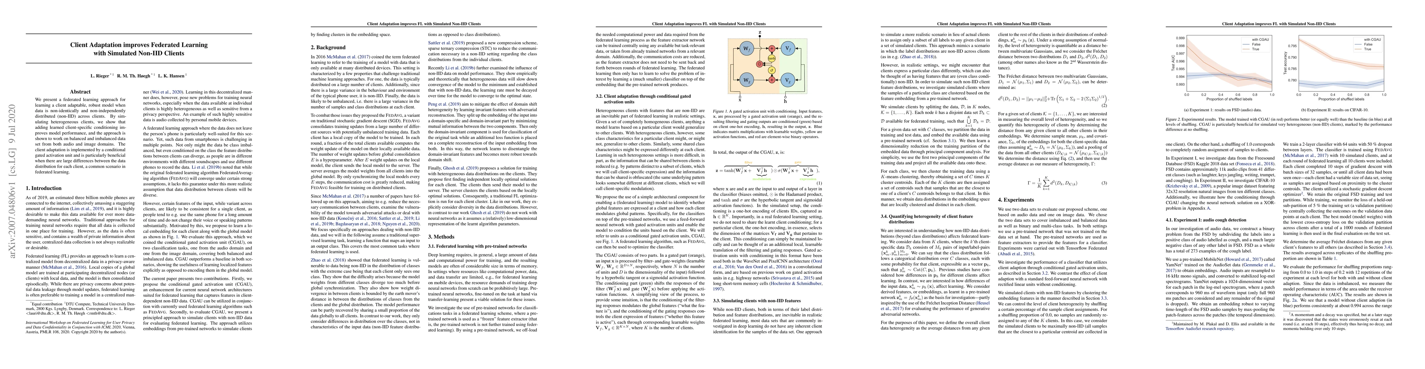 We present a federated learning approach for learning a client adaptable, robust model when data is non-identically and non-independently distributed (non-IID) across clients. By simulating heterogeneous clients, we show that adding learned client-specific conditioning improves model performance, and the approach is shown to work on balanced and imbalanced data set from both audio and image domains. The client adaptation is implemented by a conditional gated activation unit and is particularly beneficial when there are large differences between the data distribution for each client, a common scenario in federated learning.
