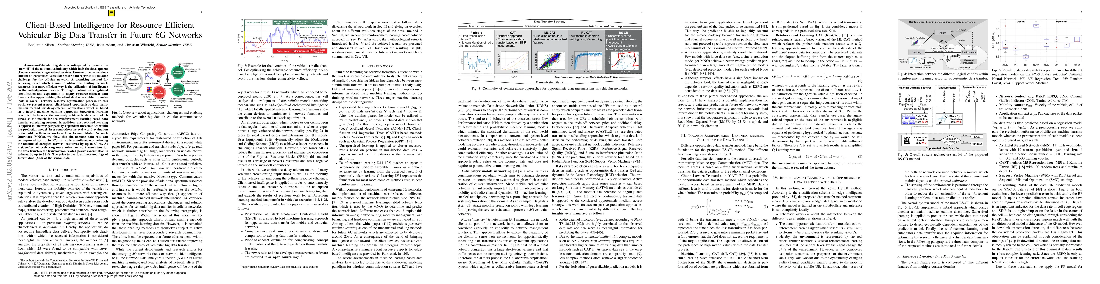 This paper proposes a novel client-based intelligence method for efficient vehicular big data transfer in 6G networks, utilizing hybrid machine learning to optimize data transmission. The approach improves data rates by up to 223% and reduces network resource usage by up to 89%, while decreasing transmission power consumption by up to 73%.