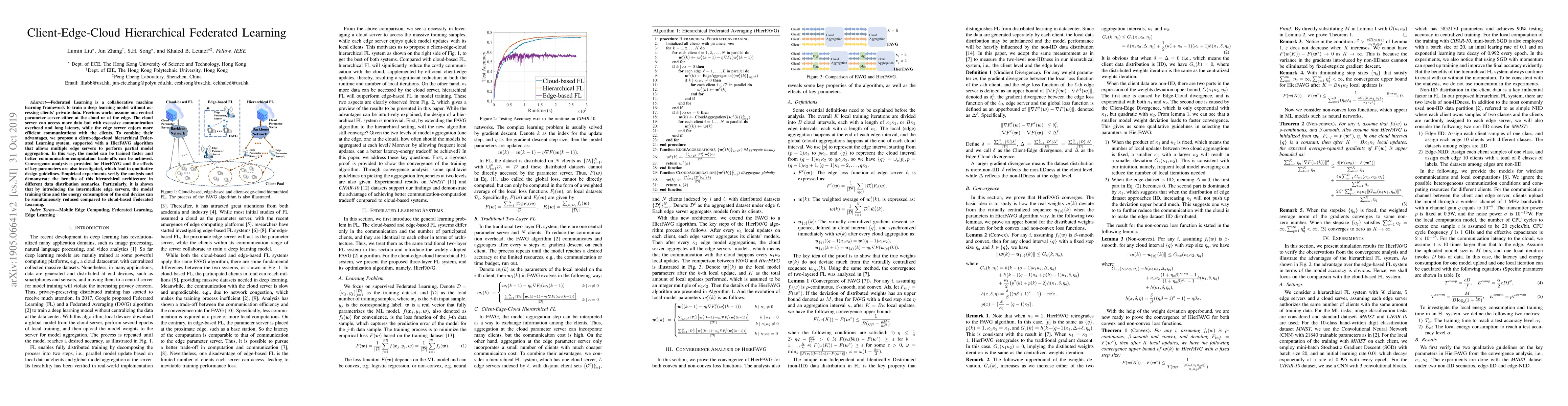 This paper proposes a client-edge-cloud hierarchical Federated Learning system with a HierFAVG algorithm for efficient partial model aggregation by multiple edge servers, achieving faster training and better communication-computation trade-offs. Empirical experiments show reduced training time and energy consumption for end devices compared to cloud-based approaches.