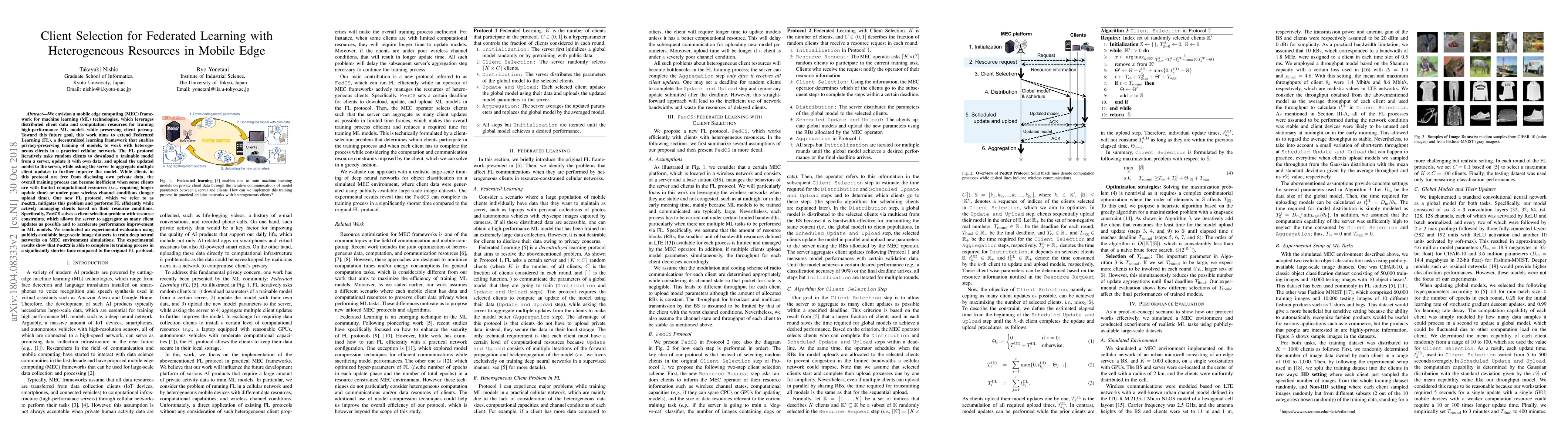 This paper proposes a new Federated Learning protocol called FedCS to efficiently train machine learning models in a mobile edge computing framework, focusing on selecting clients with optimal resources to mitigate inefficiencies caused by heterogeneous client conditions. Experimental results demonstrate that FedCS significantly reduces training time compared to the original Federated Learning protocol.
