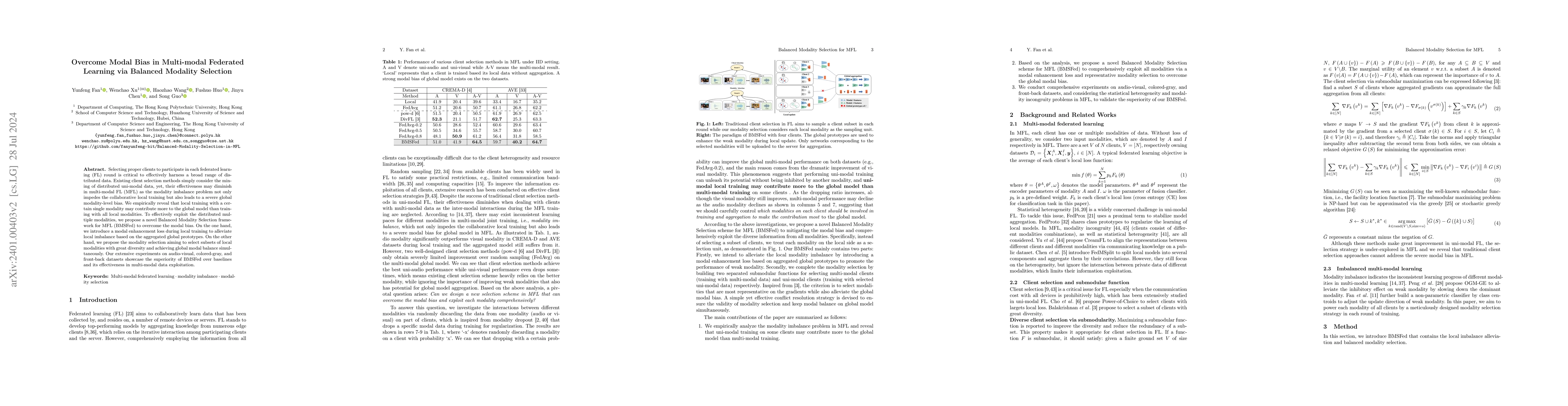 This paper proposes a Client-wise Modality Selection scheme (CMSFed) for balanced multi-modal federated learning (MFL) to address modality-level bias and enhance data exploration. The method selectively employs local data from different modalities to mitigate imbalance and employs a novel loss function and gradient decoupling method to balance the global model.