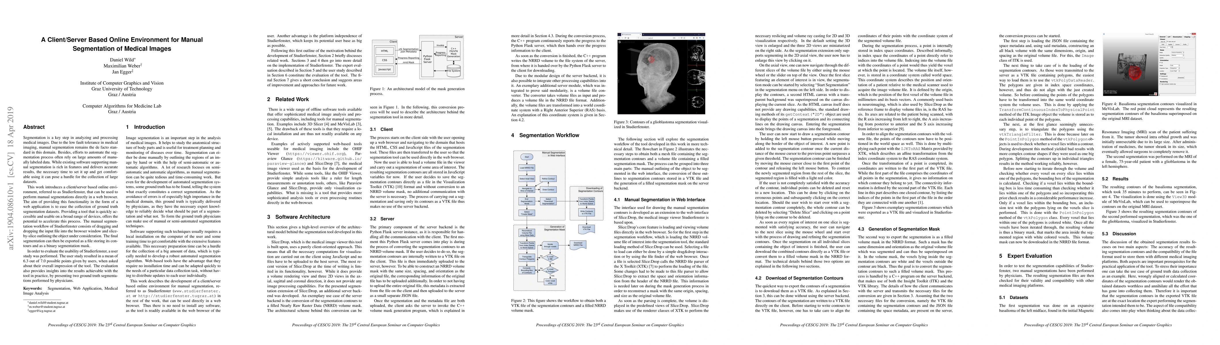 Segmentation is a key step in analyzing and processing medical images. Due to the low fault tolerance in medical imaging, manual segmentation remains the de facto standard in this domain. Besides, efforts to automate the segmentation process often rely on large amounts of manually labeled data. While existing software supporting manual segmentation is rich in features and delivers accurate results, the necessary time to set it up and get comfortable using it can pose a hurdle for the collection of large datasets. This work introduces a client/server based online environment, referred to as Studierfenster (studierfenster.at), that can be used to perform manual segmentations directly in a web browser. The aim of providing this functionality in the form of a web application is to ease the collection of ground truth segmentation datasets. Providing a tool that is quickly accessible and usable on a broad range of devices, offers the potential to accelerate this process. The manual segmentation workflow of Studierfenster consists of dragging and dropping the input file into the browser window and slice-by-slice outlining the object under consideration. The final segmentation can then be exported as a file storing its contours and as a binary segmentation mask. In order to evaluate the usability of Studierfenster, a user study was performed. The user study resulted in a mean of 6.3 out of 7.0 possible points given by users, when asked about their overall impression of the tool. The evaluation also provides insights into the results achievable with the tool in practice, by presenting two ground truth segmentations performed by physicians.